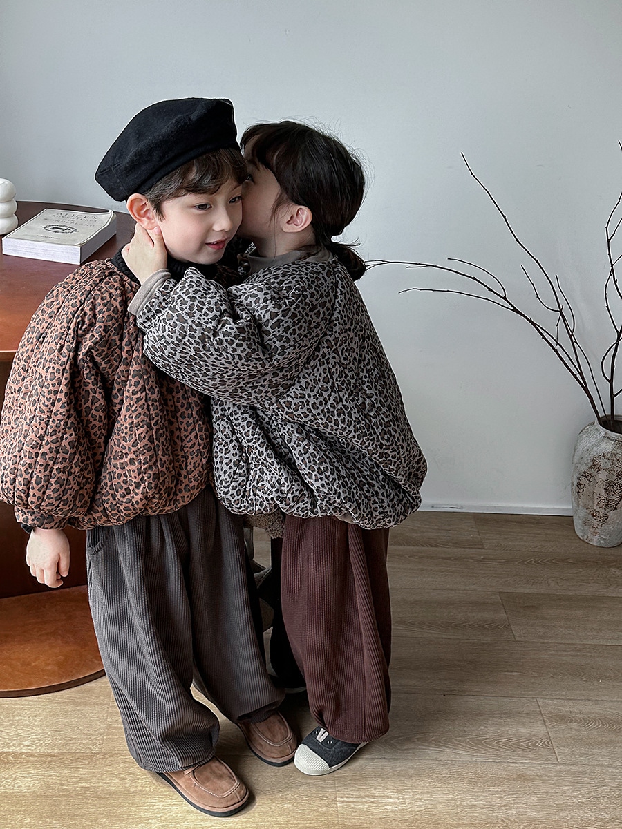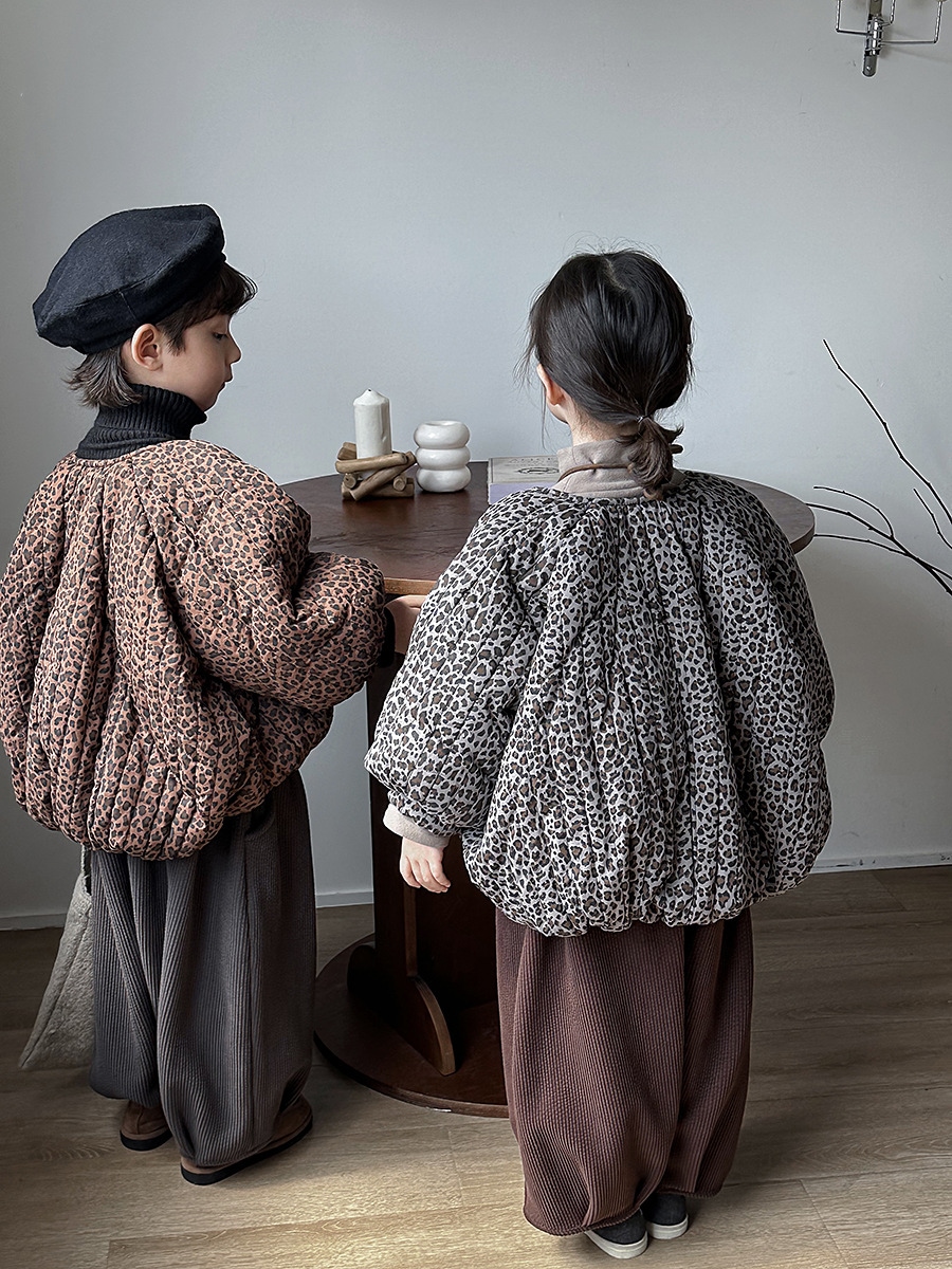 2024子供の冬の新作ヒョウ柄綿入れの中小童森系レトロなコートのパン服裏起毛 アウター