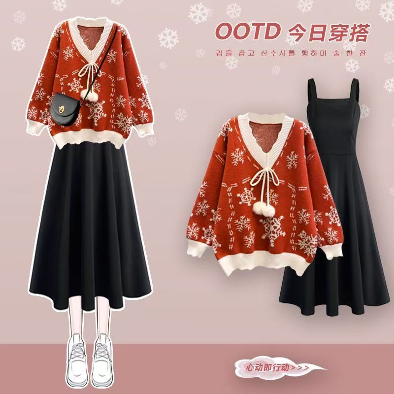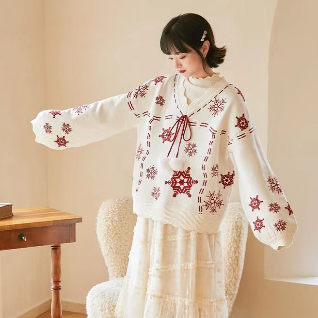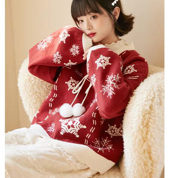 2025クリスマス新型赤い秋冬セーター雪花けだるいニット厚手ゆったりしたコート甘くて暖かい長袖上着潮 クリスマス