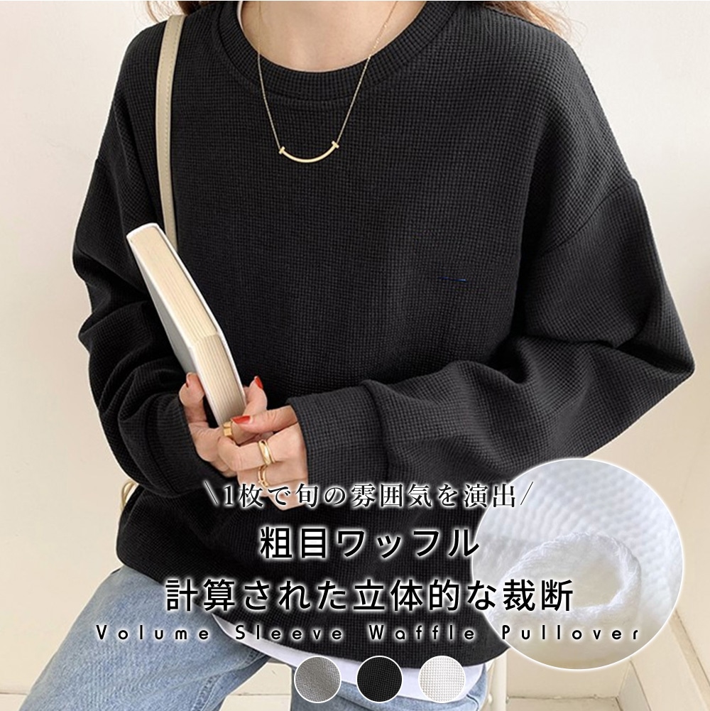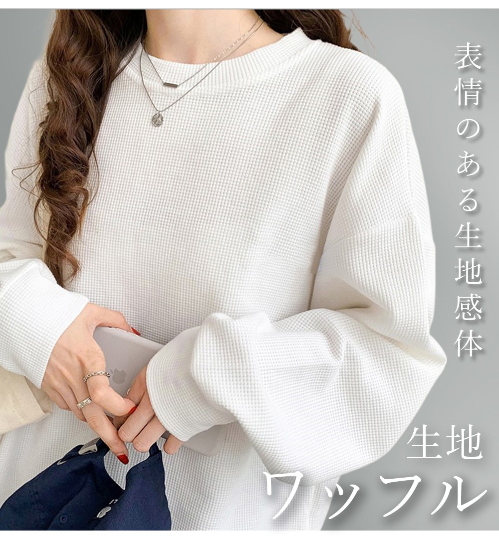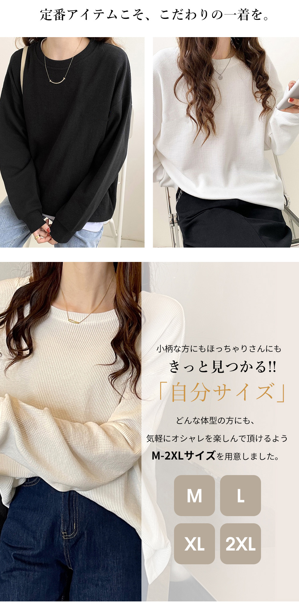 2枚同時買うと100円OFF ワッフル生地トップス長袖 メロウラウンドネック 長袖 メロウ フリル ボーダー ニット トップス カットソー ツートーン メロー おしゃれ 無地 かわいい シン