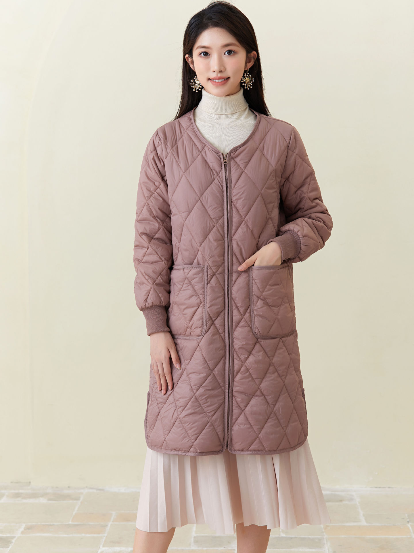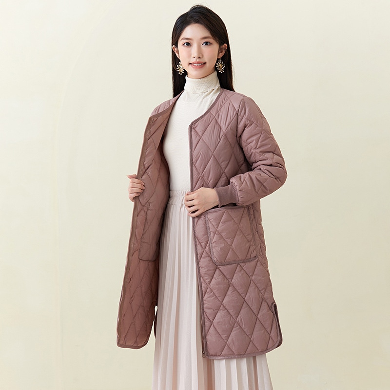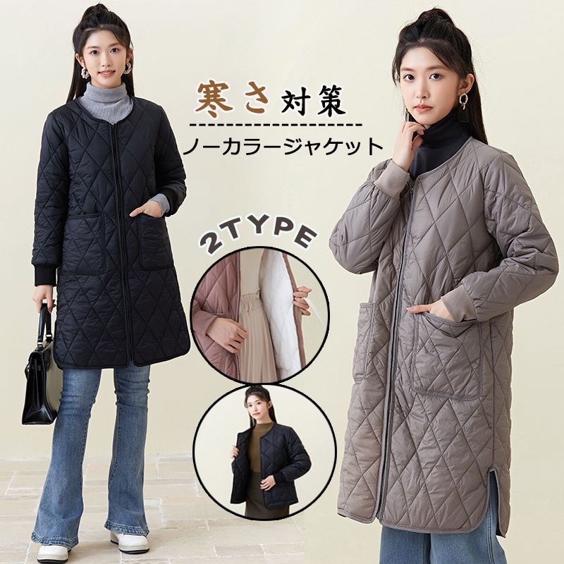 秋冬新品入荷レディース厚手ウォーム長袖中綿コートセミロング中綿アウター 超軽量 ルームウェア キルティングアウターノーカラージャケット