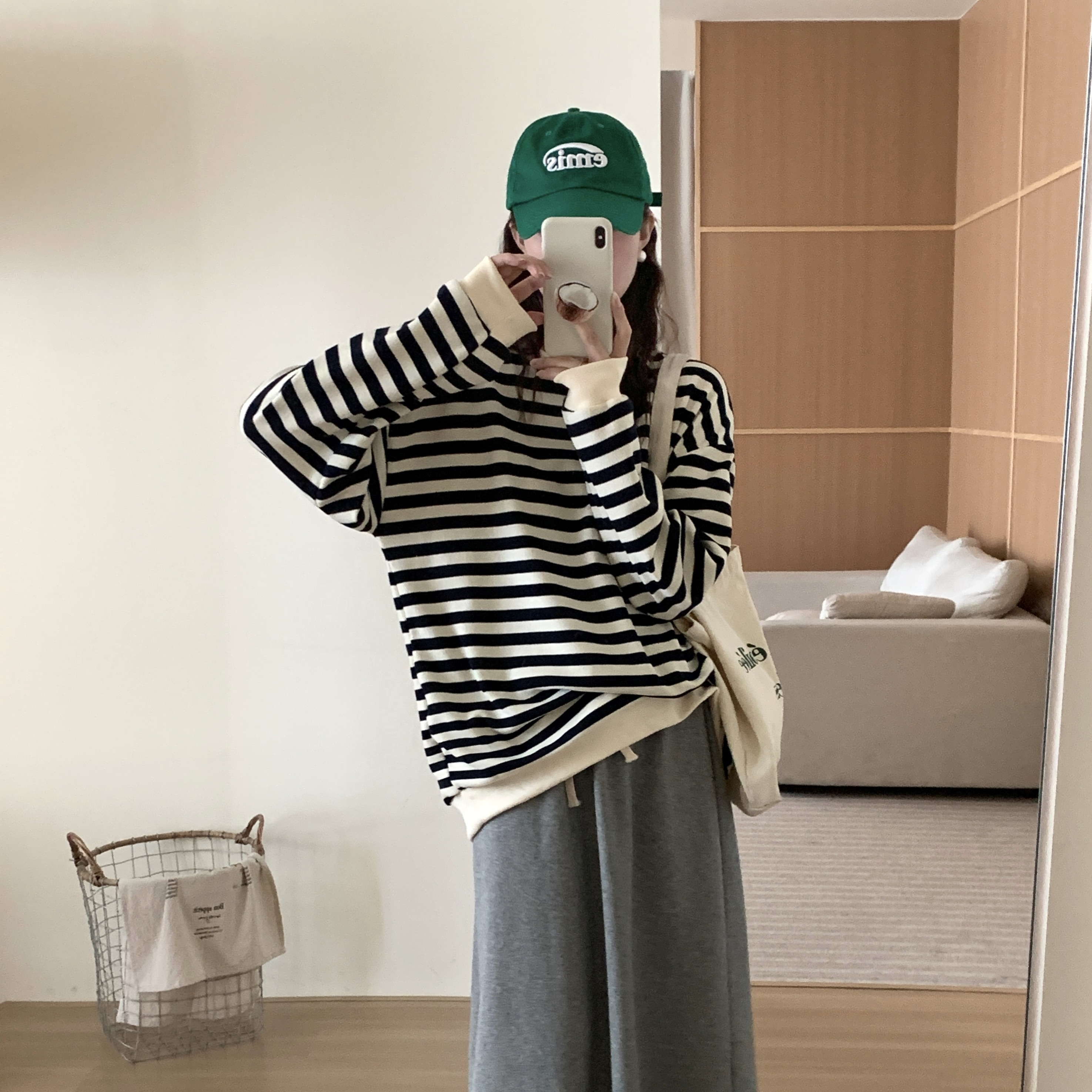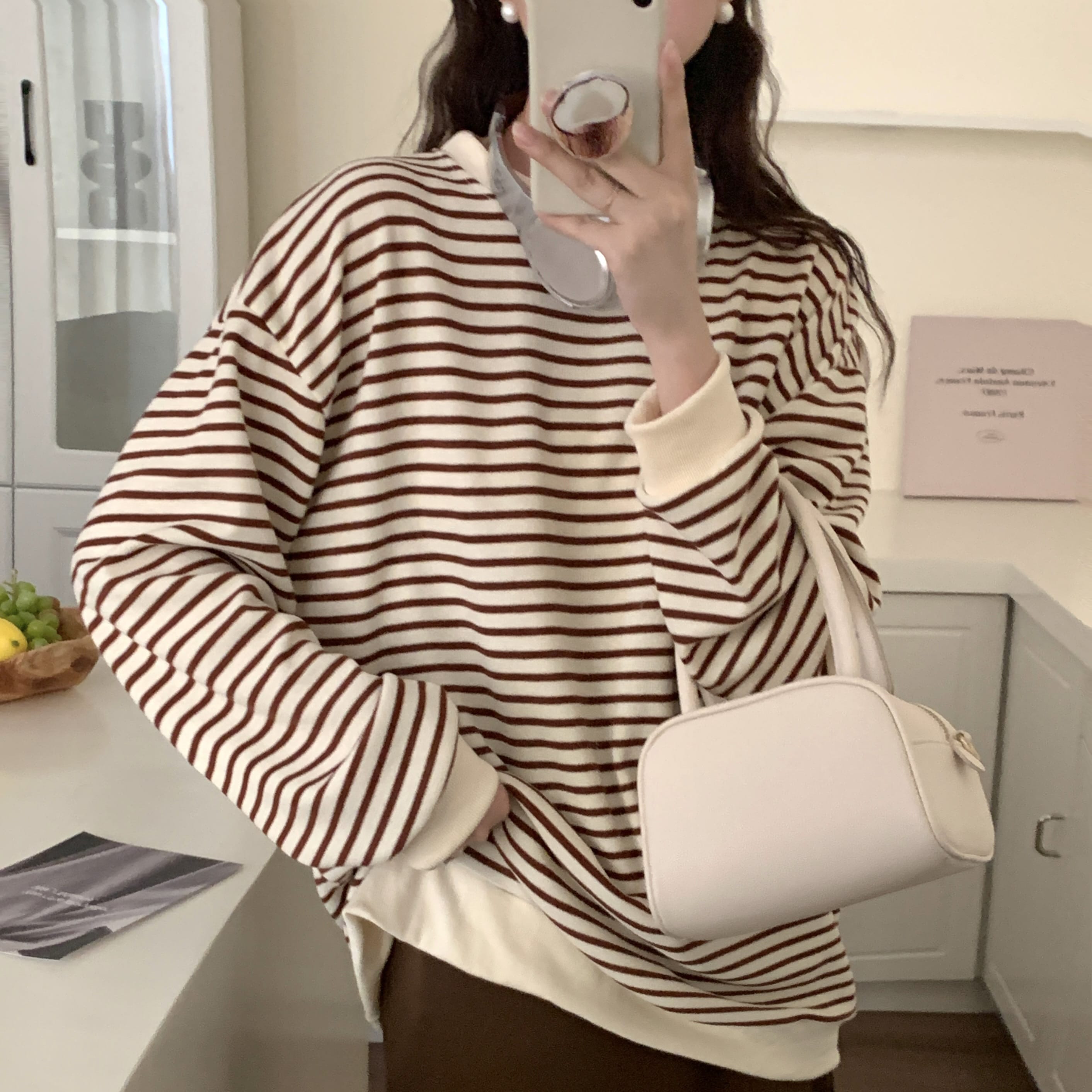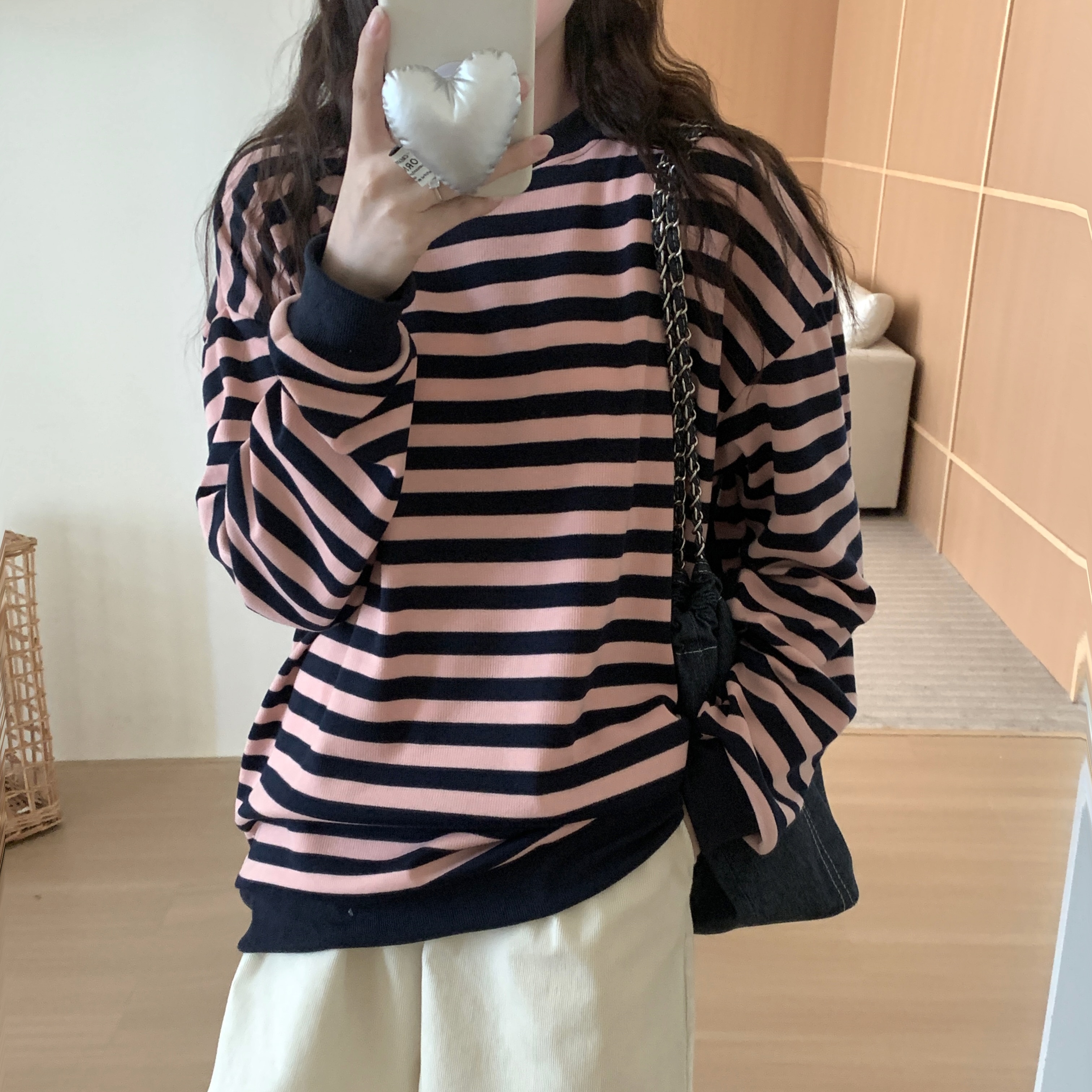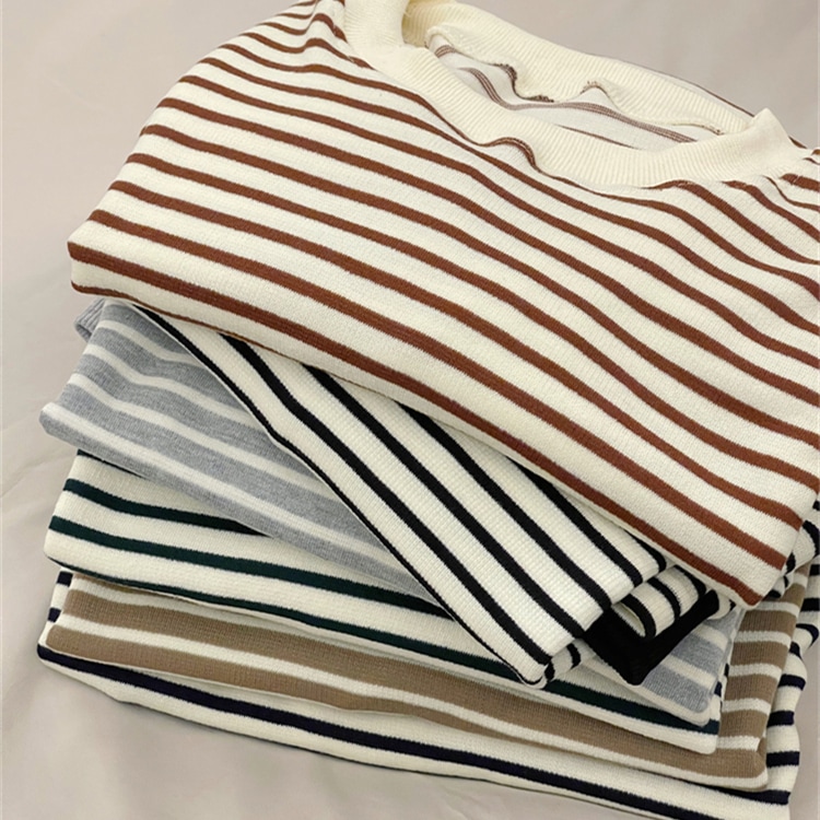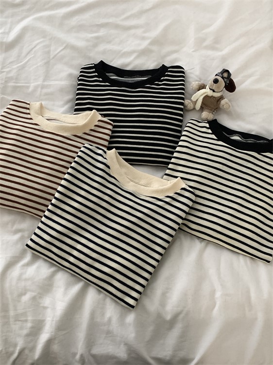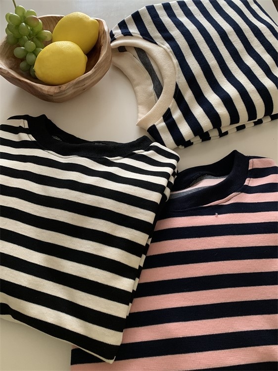 ニットタッチ万能ボーダーカットソー Tシャツトレーナースウェットトップス ストレッチドロップショルダー韓国ファッション