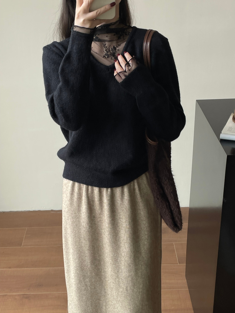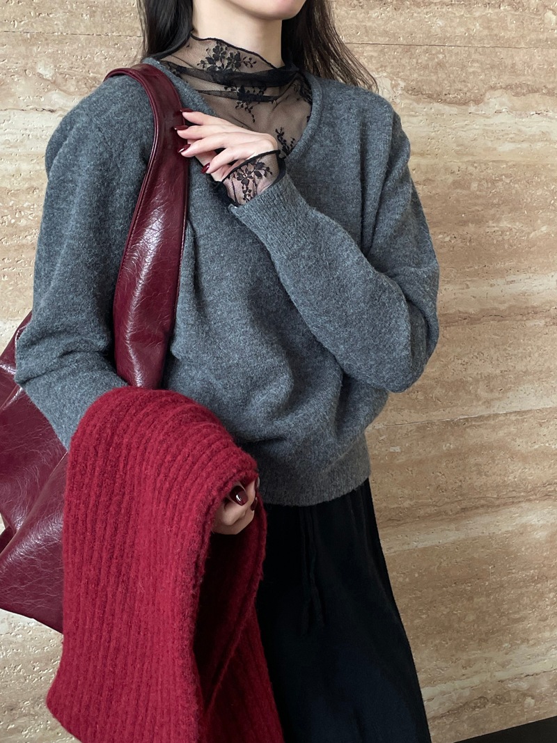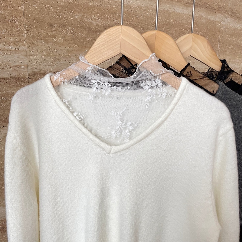 ニット レディース レース切り替え トップス レースネック カットソー ベーシック レース袖裾 長袖 コットン 柔らかい 着痩せ 女性らしい 暖かい 上品 大人 春 秋 柔らかい カシミアタッチ 通勤