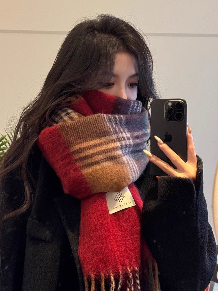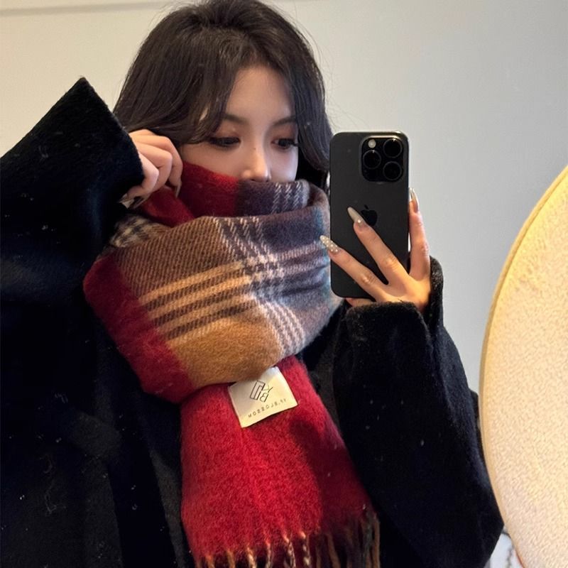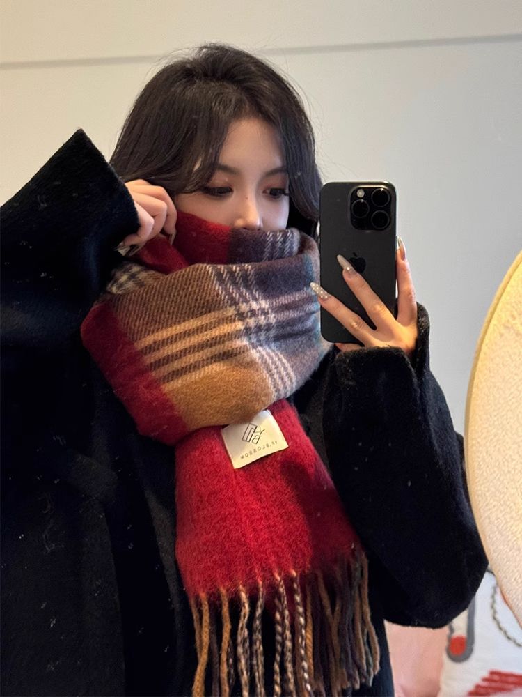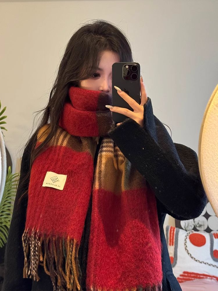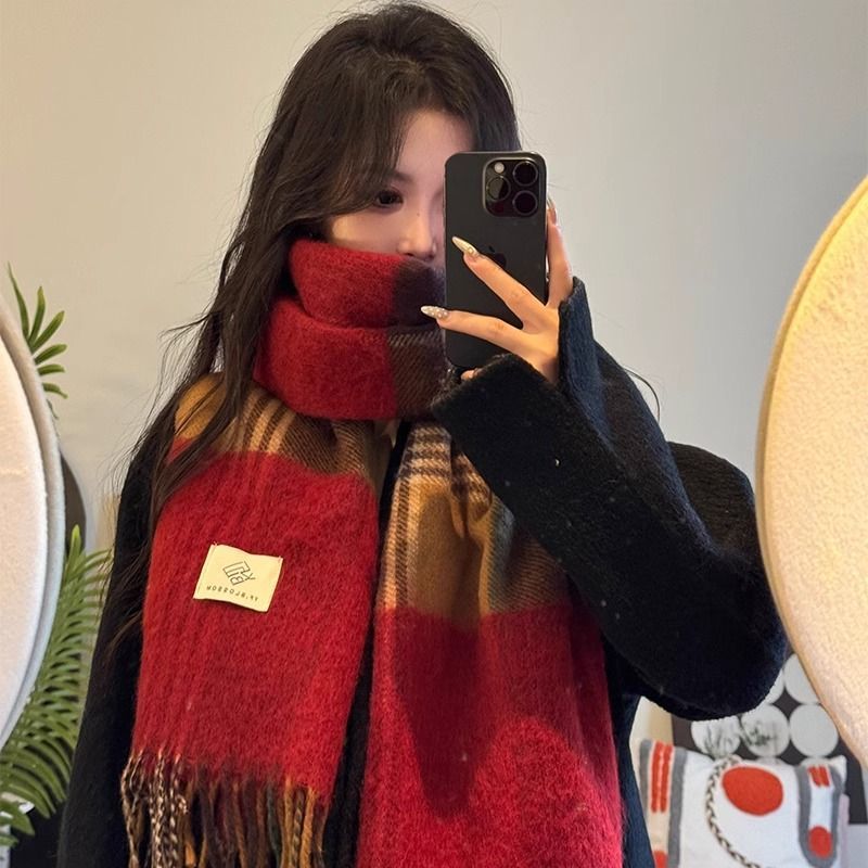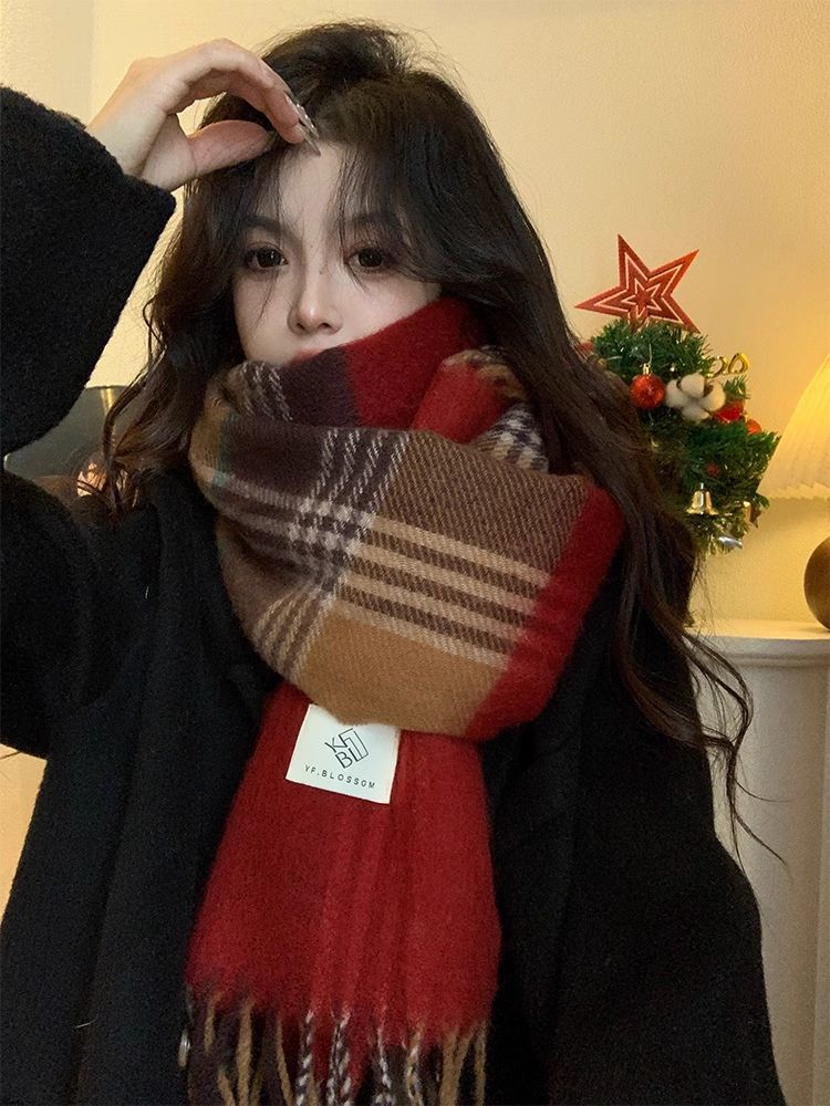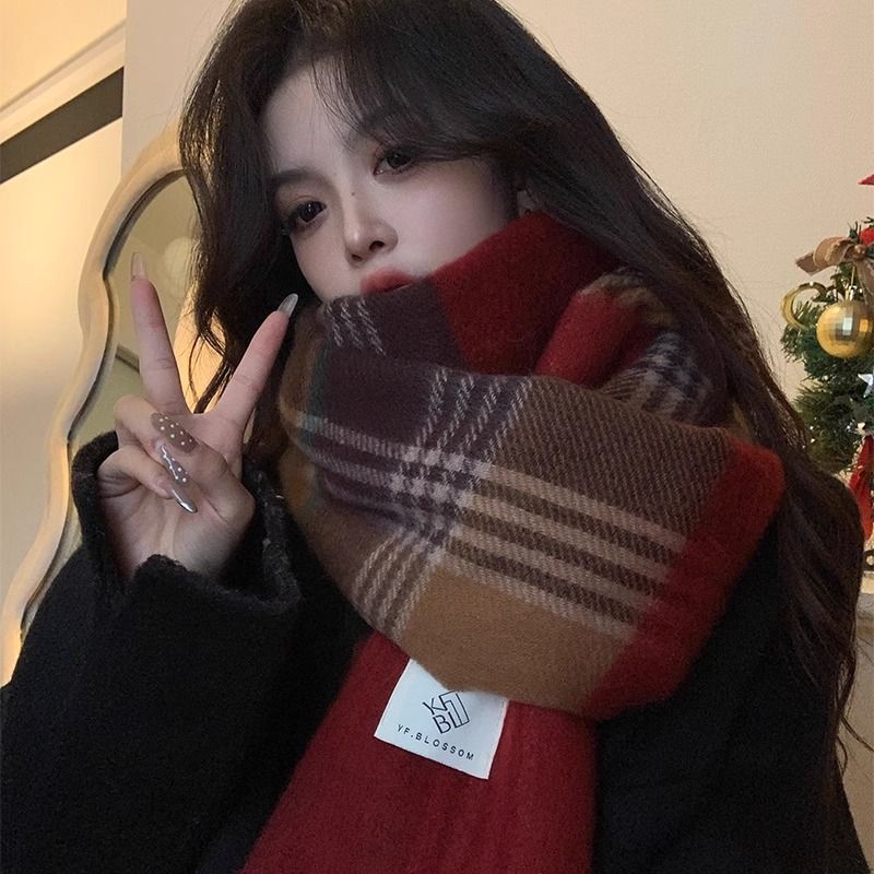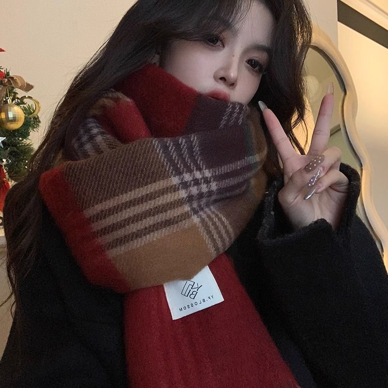 赤い格子の新型韓国版百合復古高級マフラーの首を巻いてカップルの冬の保温学生のマントを厚くする マフラー