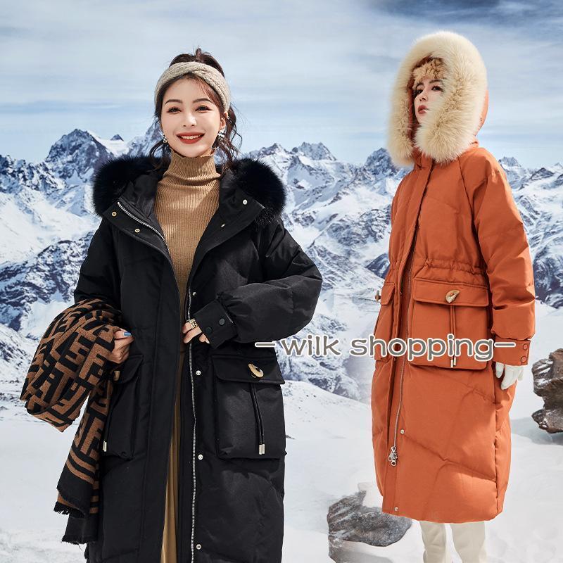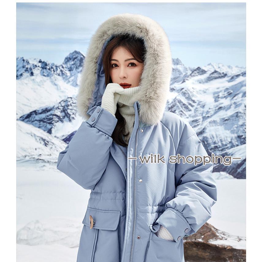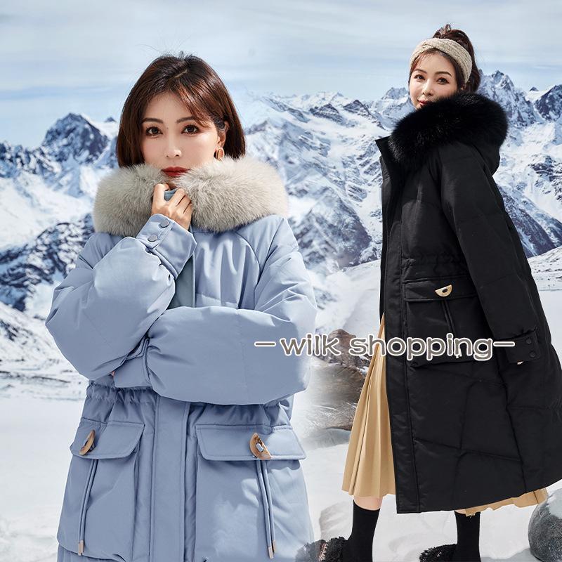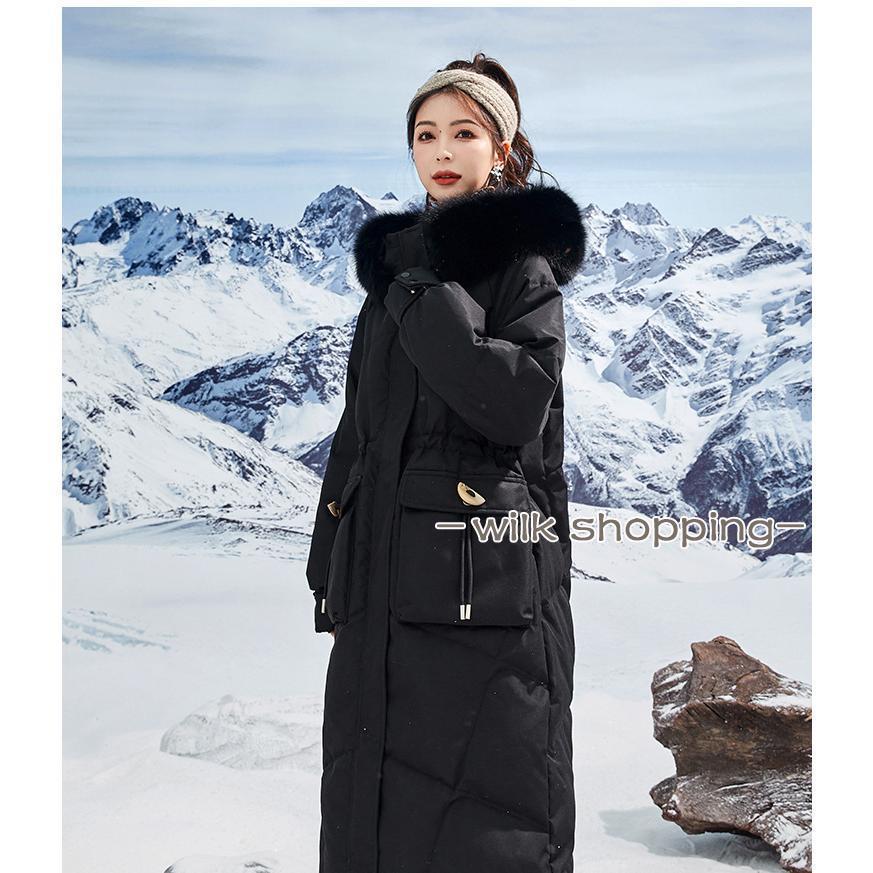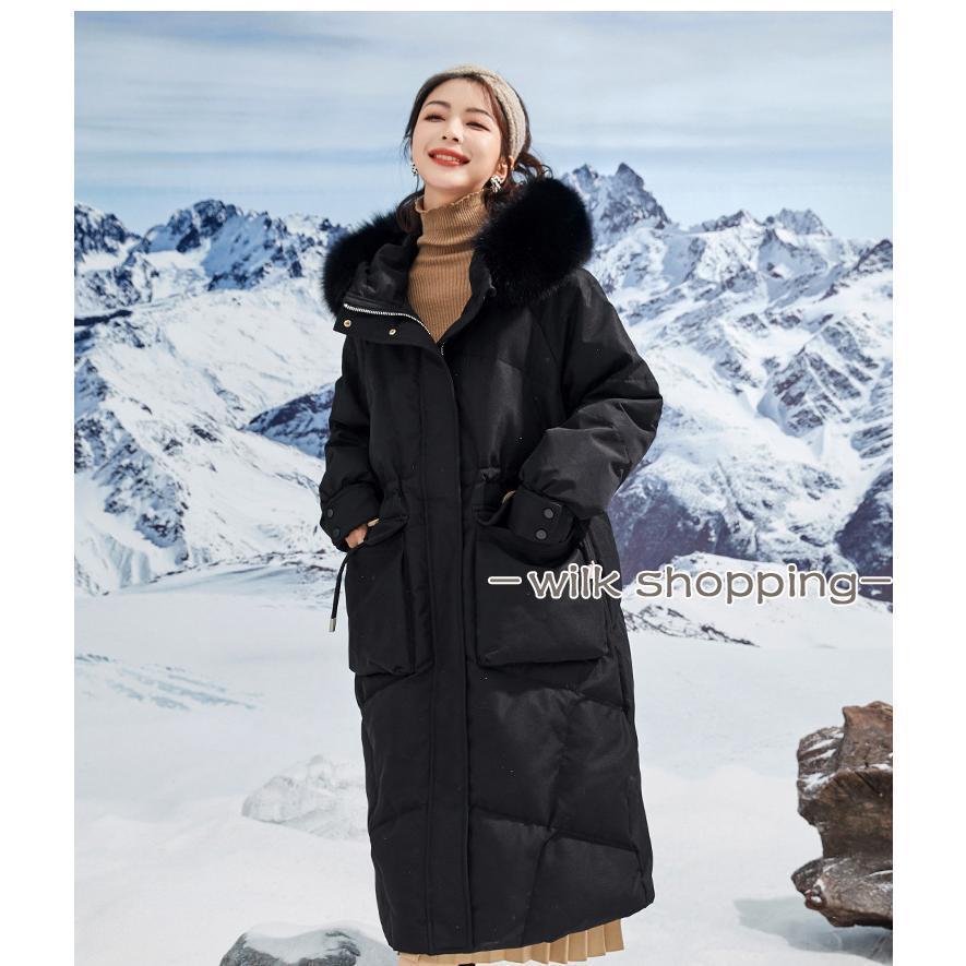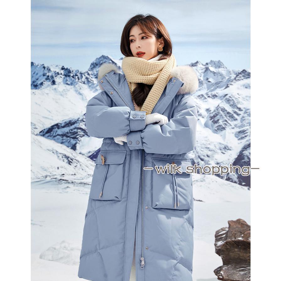 ロングダウンコート レディース ダウンジャケット ダックダウン 黒 ブルー M L 高級 ファー付き アウター ジャンパー 前開き 暖かい 防寒 撥水