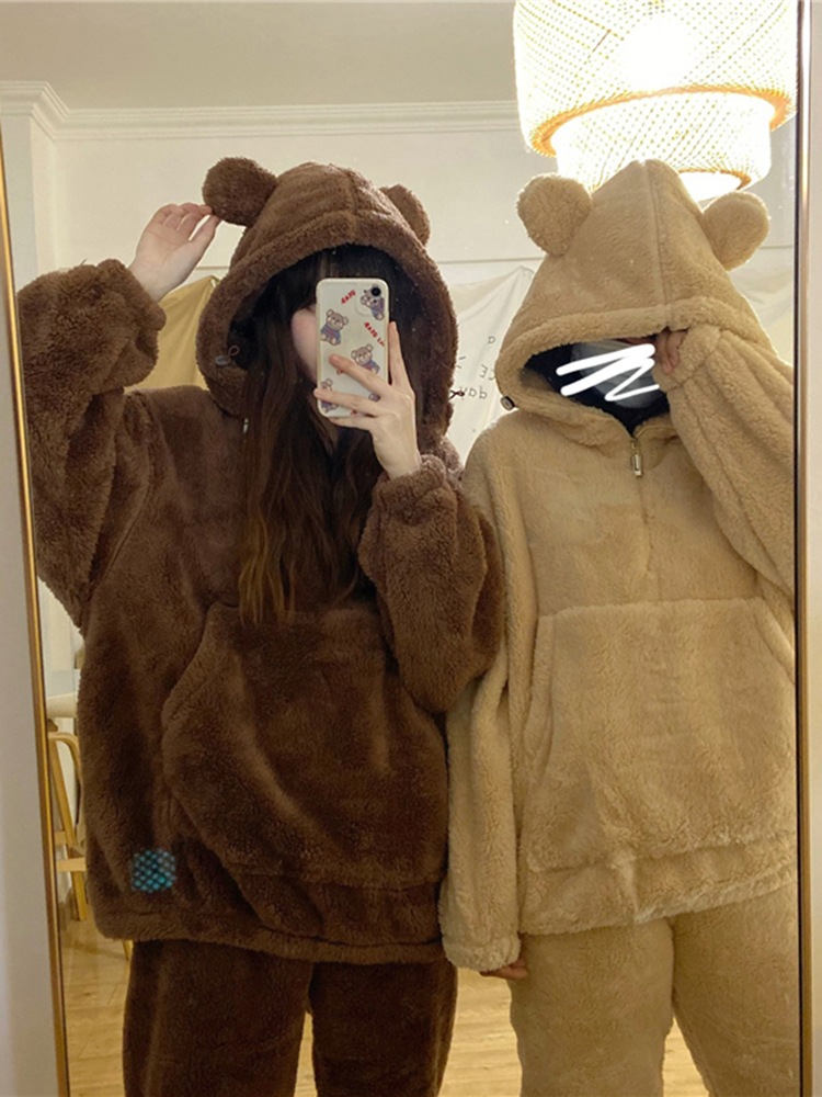 パジャマ 冬ルームウェア 冬のベアーとベルベットのパジャマ冬の女性秋冬の新しいかわいいベルベットの厚い家庭服セット パジャマ