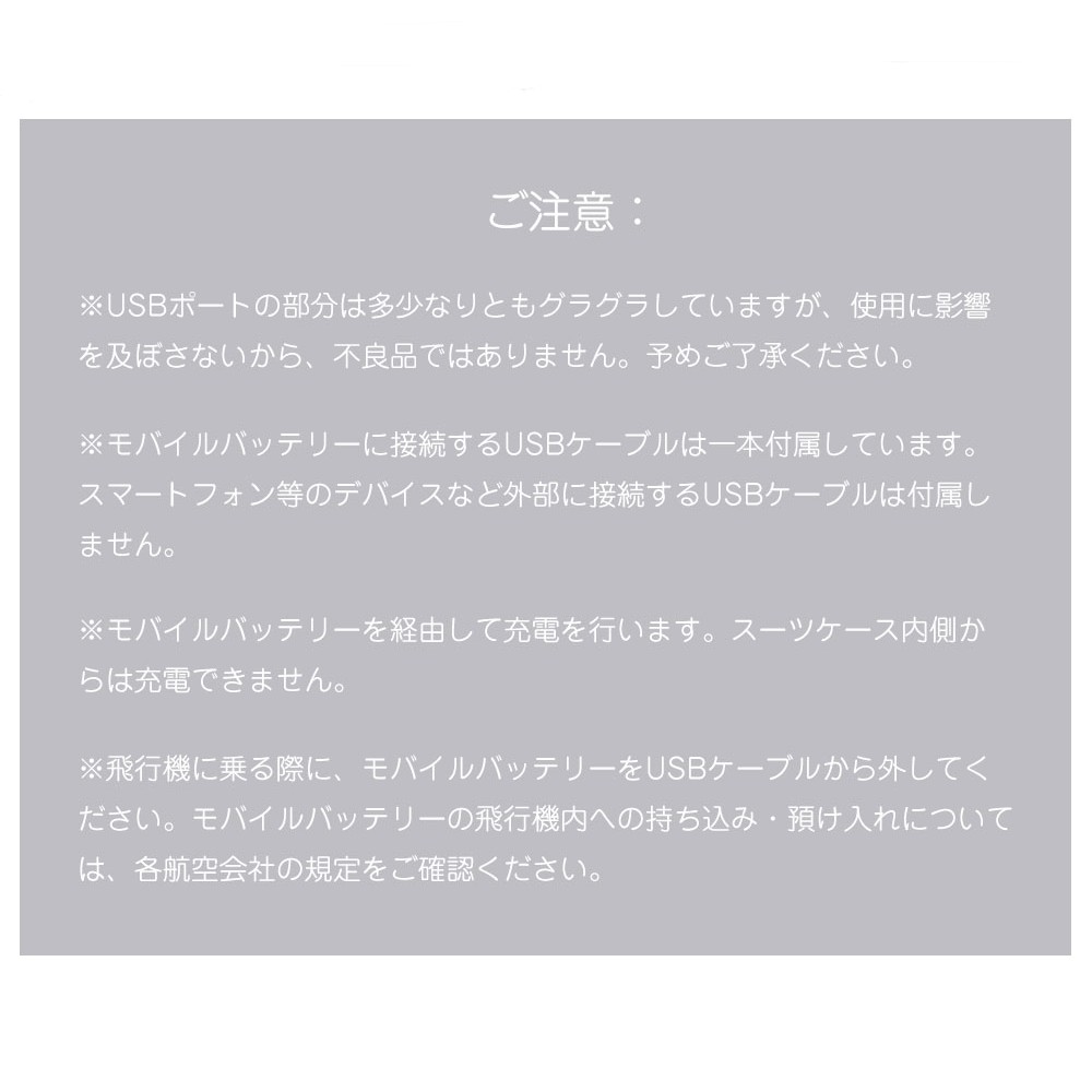 POINT 3.【移動中も充電できる】内側にお手持ちのモバイルバッテリーを接続すれば、簡単に充電できます。USB充電ポートのお使い方:1.ケーブルにモバイルバッテリーを接続します。2.USBコネクタに接続することで、スマートフォンなどの電子機器を充電することができます。ご注意: ※モバイルバッテリー、スマートフォン等のデバイスに外部接続するUSBケープル・アダプタ等は付属しません。 ※モバイルバッテリーを経由して充電を行います。スーツケース内部からは充電できません。※モバイルバッテリーの航空機内への持ち込み・預け入れについては各航空会社の規定をご確認ください。※コネクタに強い衝撃を与えないようにご注意ください。 ※航空機を利用する際は、モバイルバッテリーをUSBケーブルから外してください。※内側のモバイルバッテリーがポケットに入っている可能性があります。受け取り後にモバイルバッテリーが見つからない場合は、チャックを開けて確認してください。