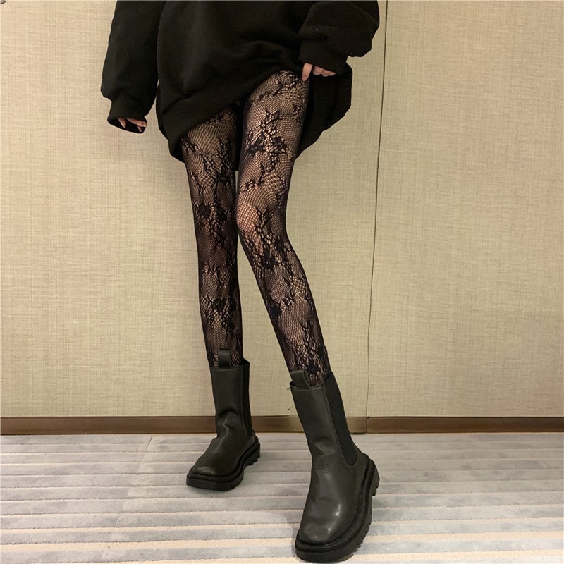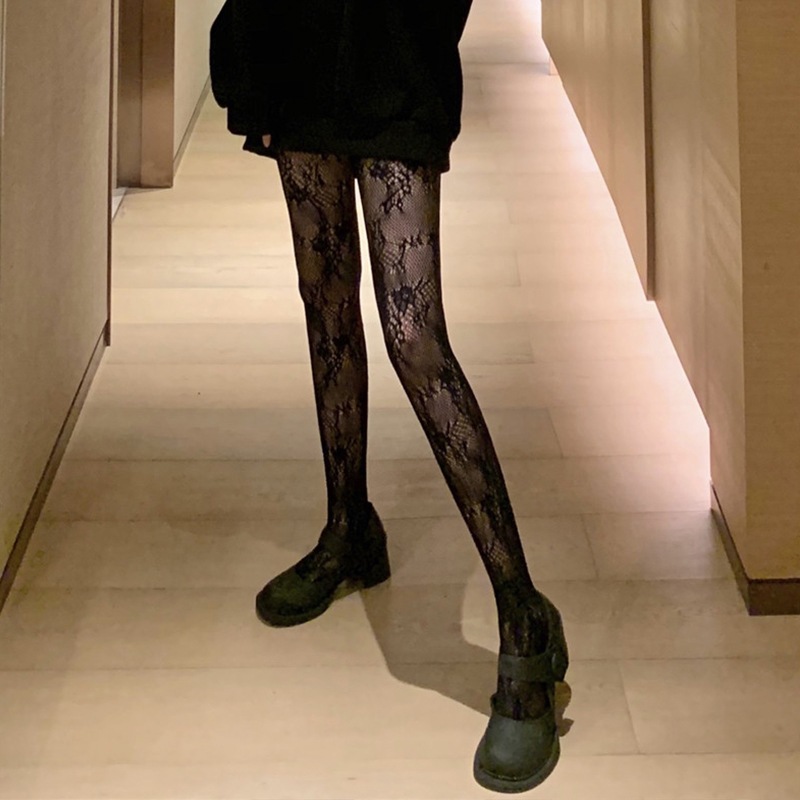 2024年春の新しいレトロな香港風味の中空レースのセクシーなネットストッキング黒の薄いベースストッキング女性シック ストッキング