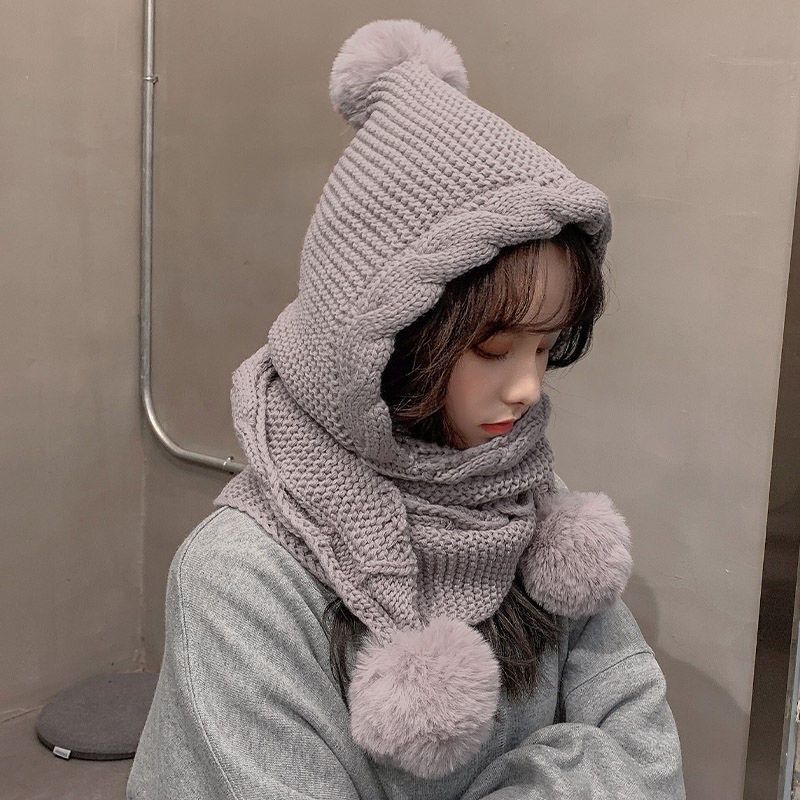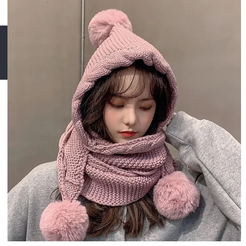 秋冬新作帽子 韓国ファッション 毛糸ハット ニット帽子 スカーフ マフラー一体キャップがかわいい毛玉の耳当て 一体キャップ日系 厚手ウォーム小顔効果百掛け キュート ゆったり新作