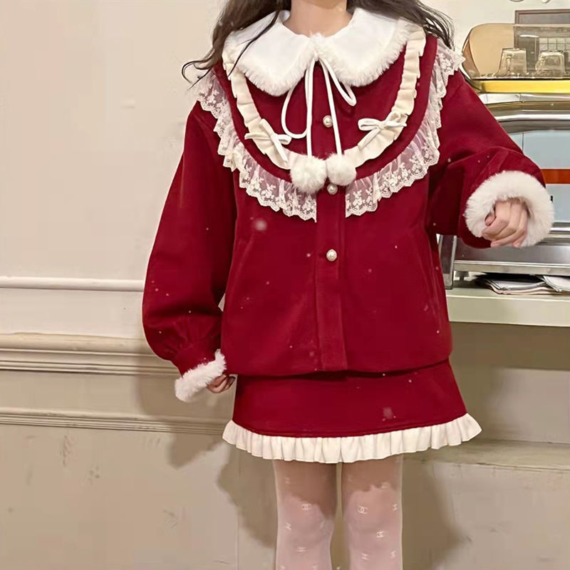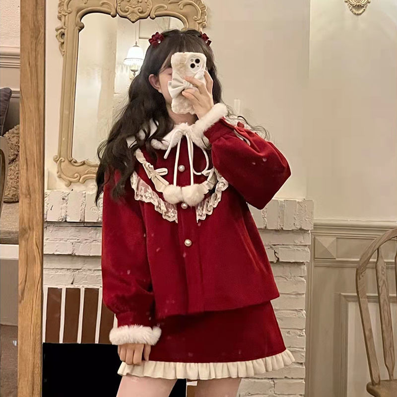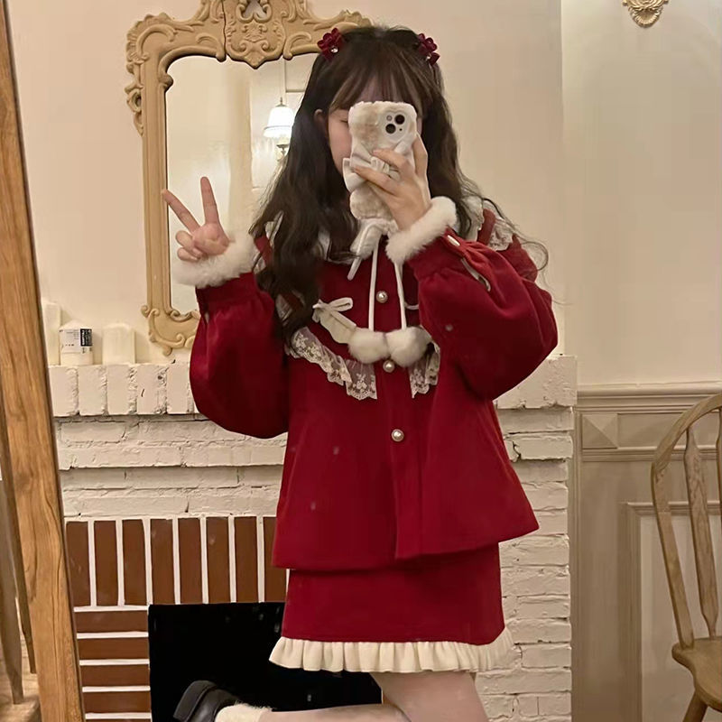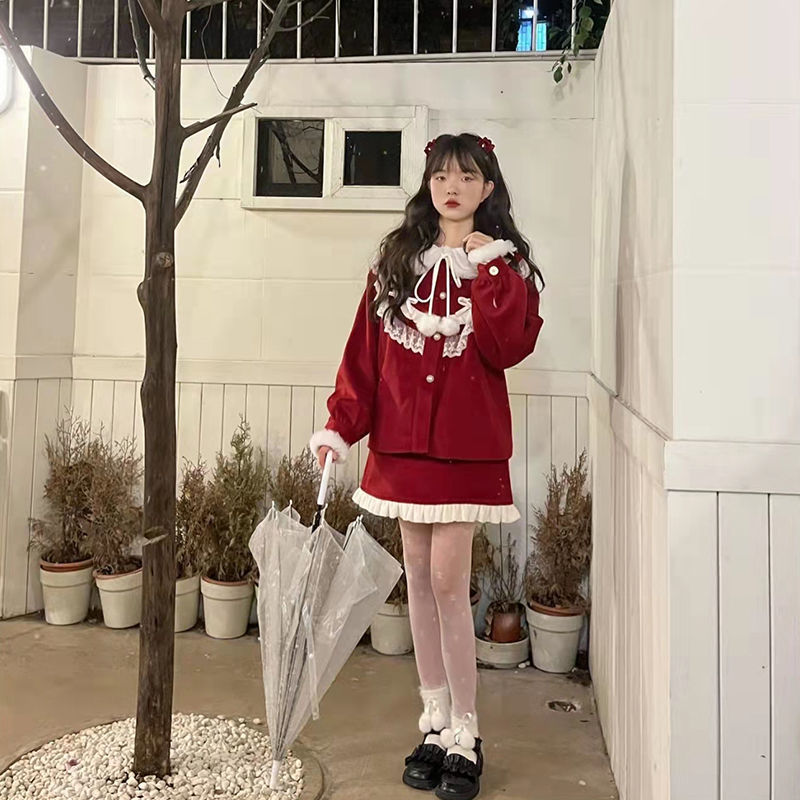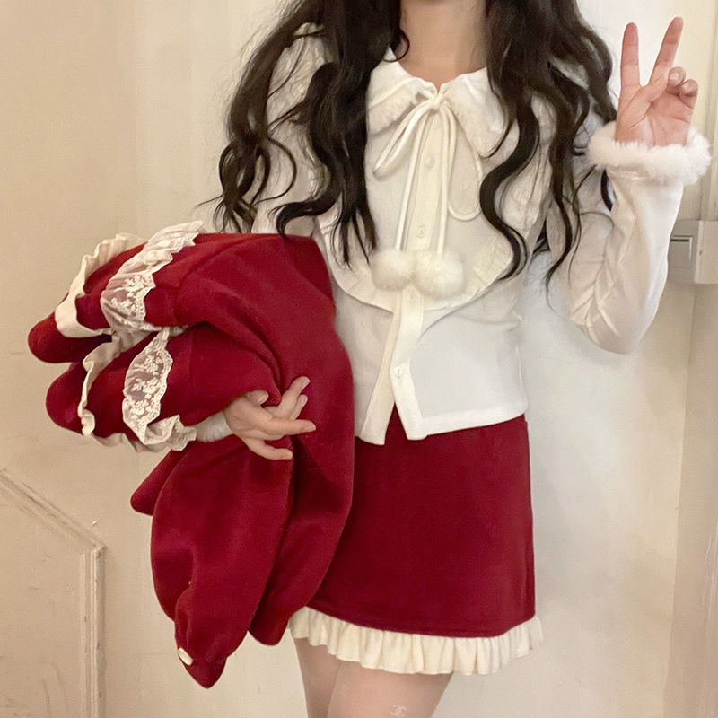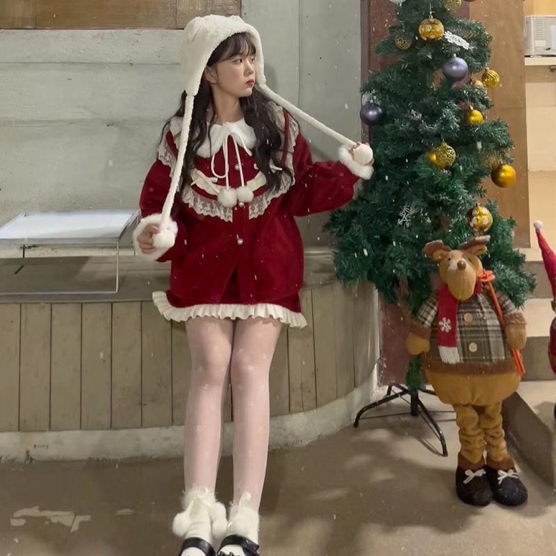 涼しく楽ちんセットアップサンタコスプレ クリスマス冬の新作レッドベルベットニューイヤーユニホームモッズスーツ女性用ショート丈トップス半身スカート3点セット レディース ハロウイン