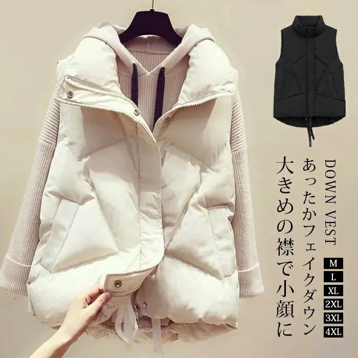 ダウンベストレディース大きいサイズアウタージャケットベスト中綿フェイクダウン上着羽織りハイネック軽量春秋フェイク通勤通学暖かい無地お出かけノースリーブゆったり体型カバー大人可愛い