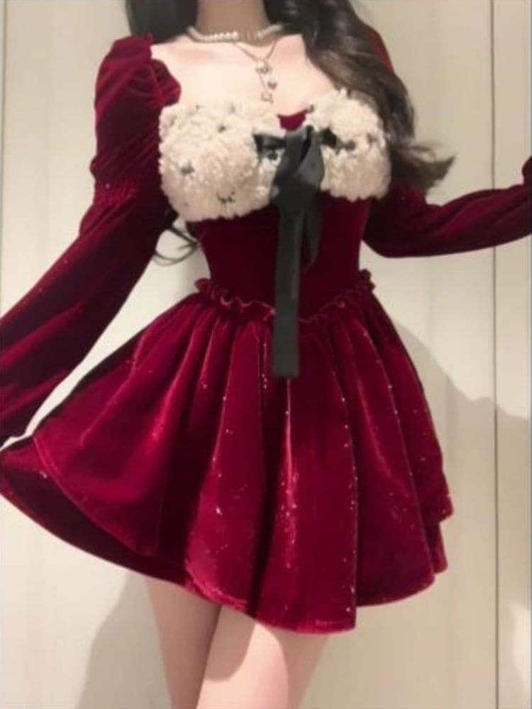 サンタコスプレ と ベルベット レイヤー ファイングリッター ふわふわスカート スクエアネック ドレス ドレス クリスマス レディース 韓国