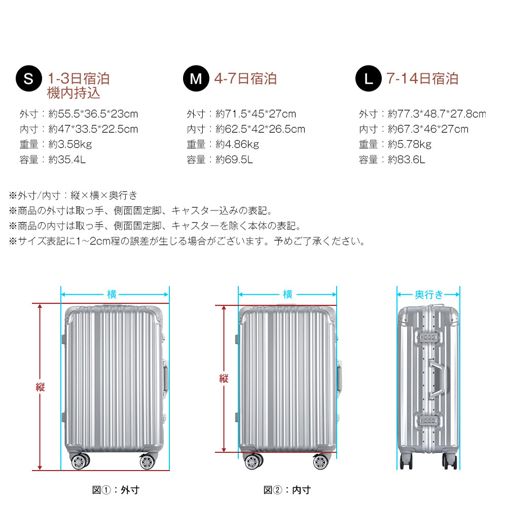 【S 1~3日宿泊 機内持込 】外寸:約55.5*36.5*23cm 内寸:47*33.5*22.5cm 重量:約3.58kg 容量:約35.4L 【ご注意】①掲数している写真は、ご使用のコンピューター及びスマホのモニターの種類によって、実際の商品のイメージと多少異なることがございます。予めこ了承ください。②ロットによって、製品の色は多少異なりますので、こ了承とこ理解の程よるしくお願いたします。