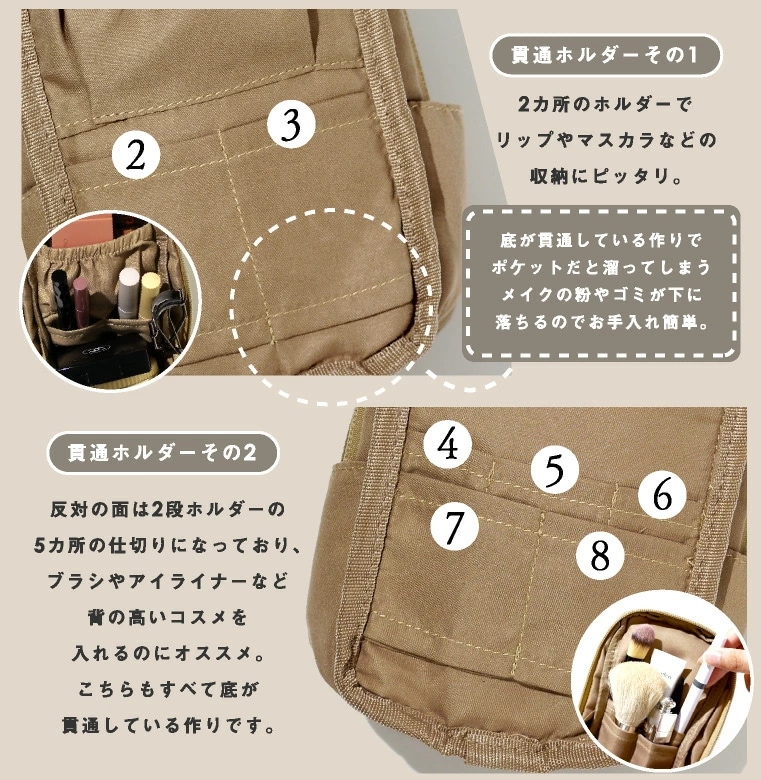 裏地は汚れが目立ちにくいベージュで統一。