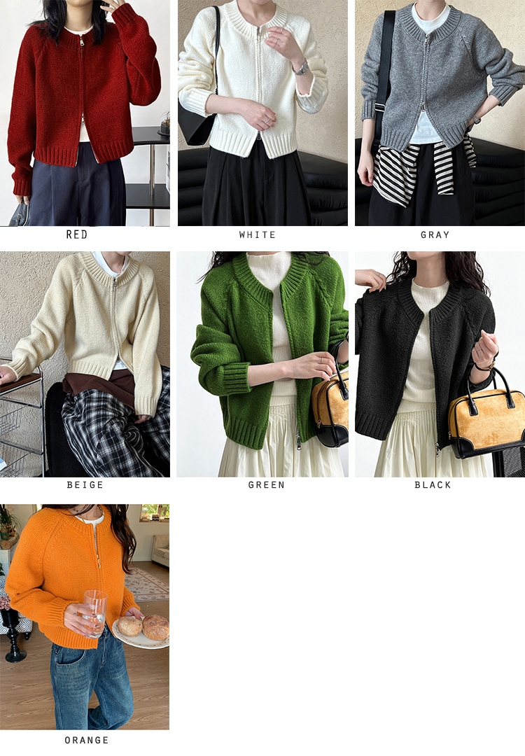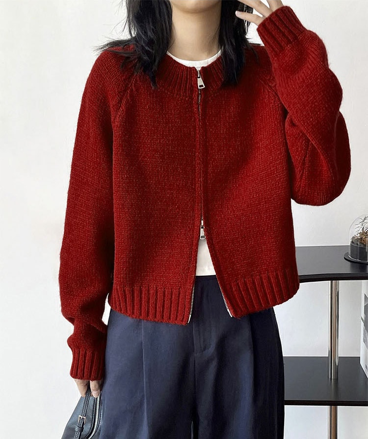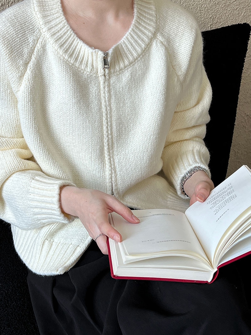 トップス アウター カーディガン ニットセーター レディース 秋冬 長袖 ラウンドネック ニット 厚手 ファスナー ダブルジップ ショート カジュアル 黒 グレー 白