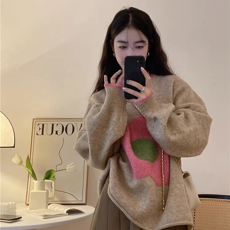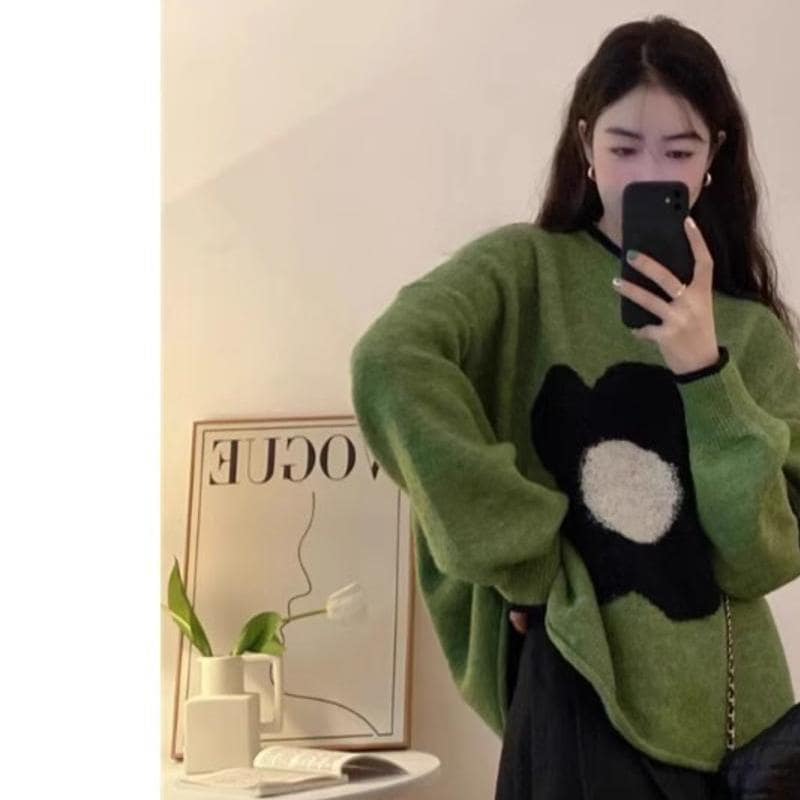 カシミャタッチ かわいいデザイン感小衆グリーンの花ニットセーター秋冬新作ぶつかり色ゆったり丸首長袖トップス メガ割 ニットカーディガン ベーシックニット リブニット