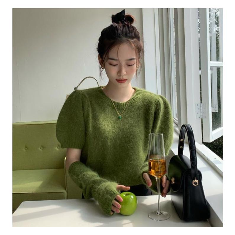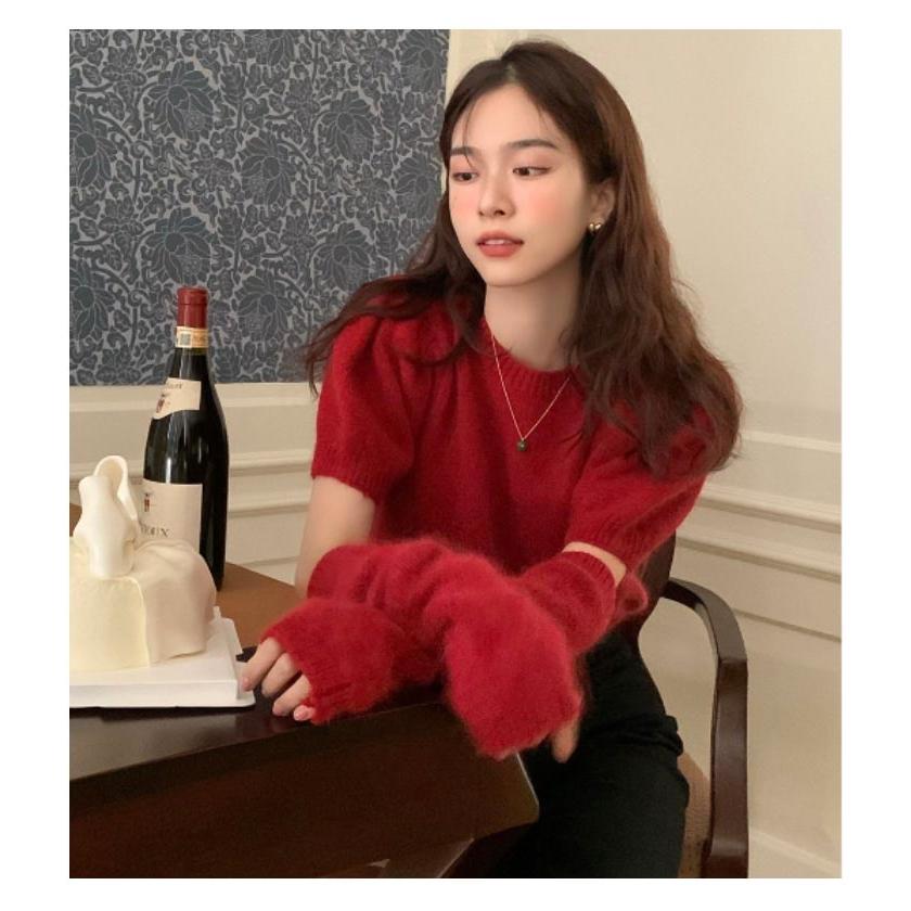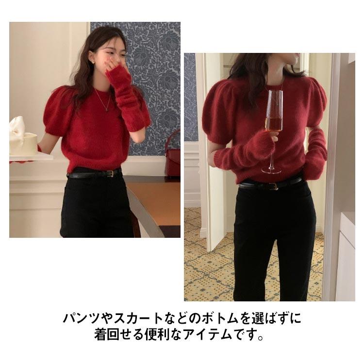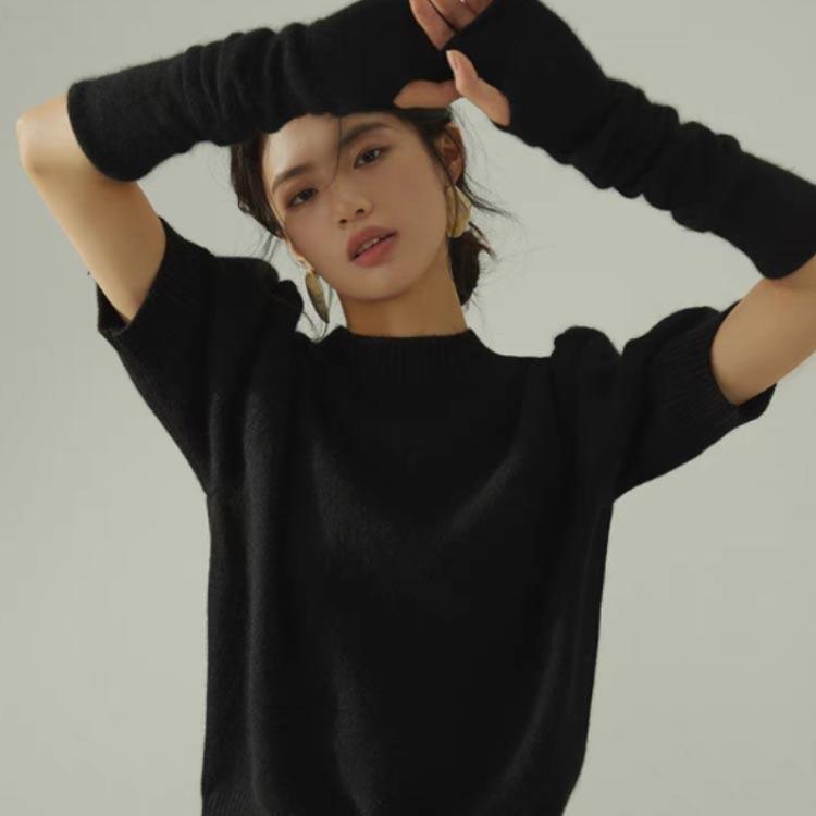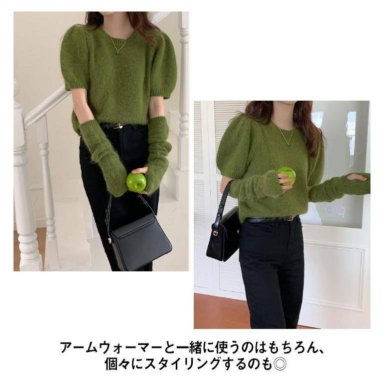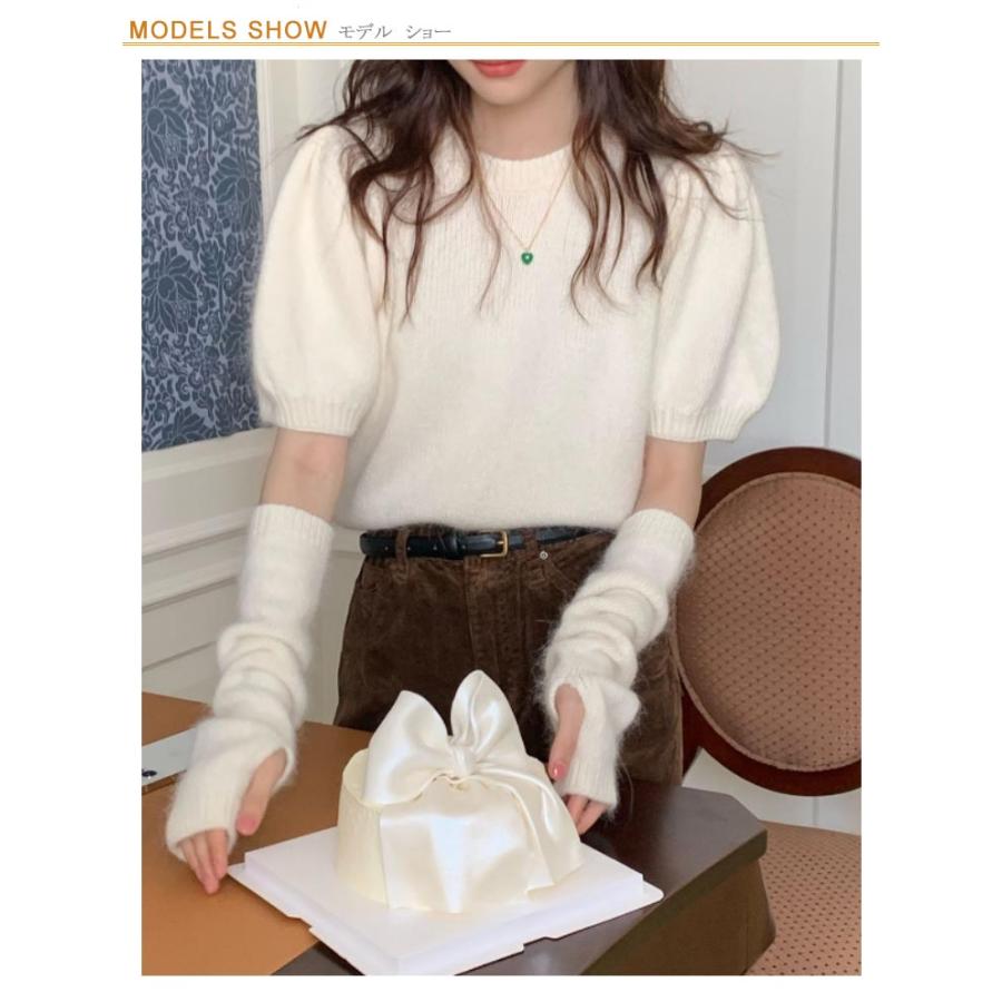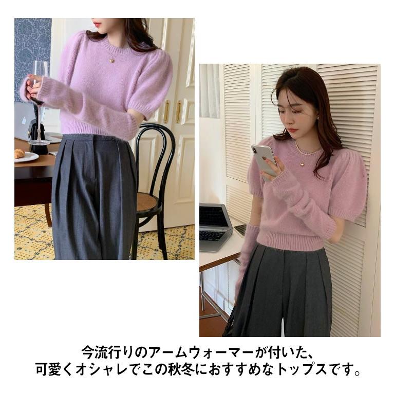 人気商品超目玉 ニット セーター トップス レディース 半袖 半袖ニット 秋 冬 アームカバー付き クルーネック もこもこ ふわふわ アームウォーマー付き