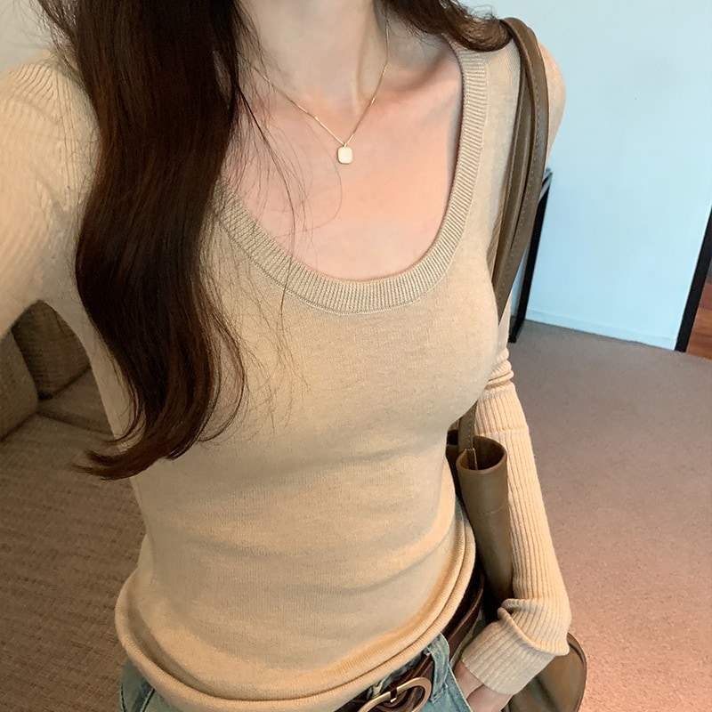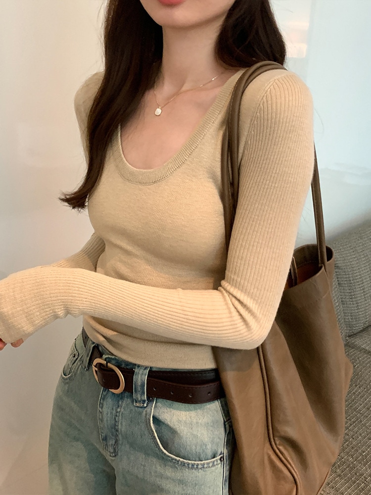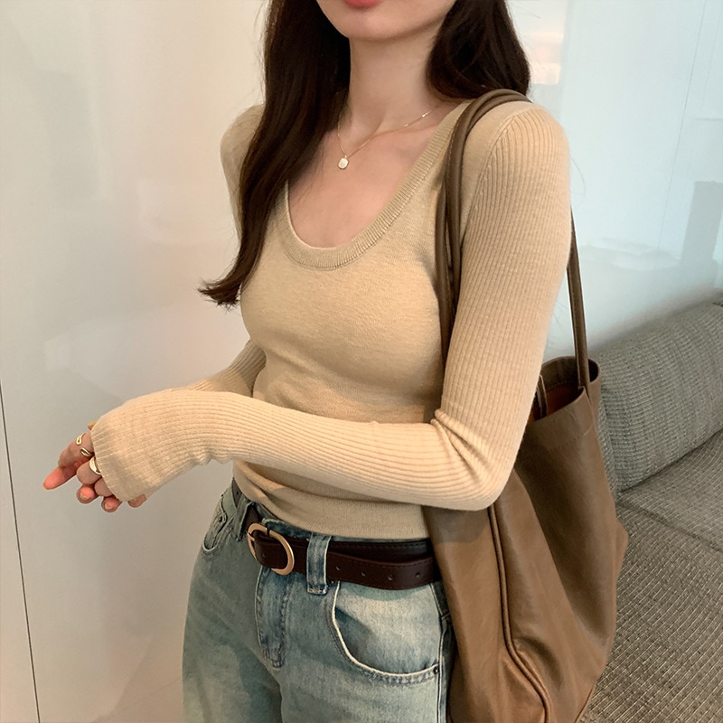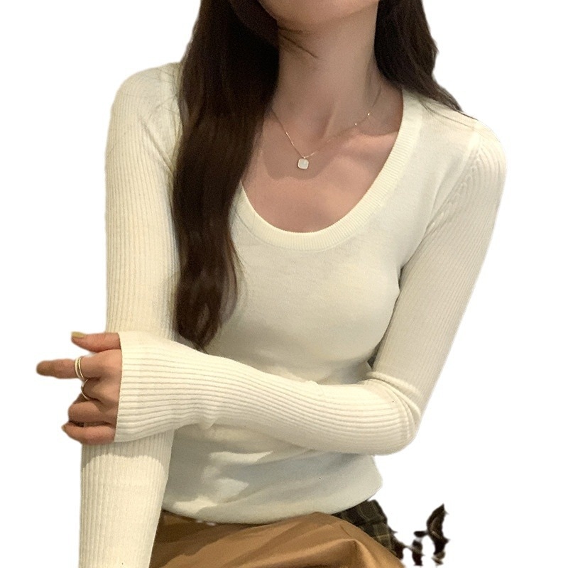 Uネック長袖スリムボトムシャツレディースニットトップス2024秋長袖インナー チュニック
