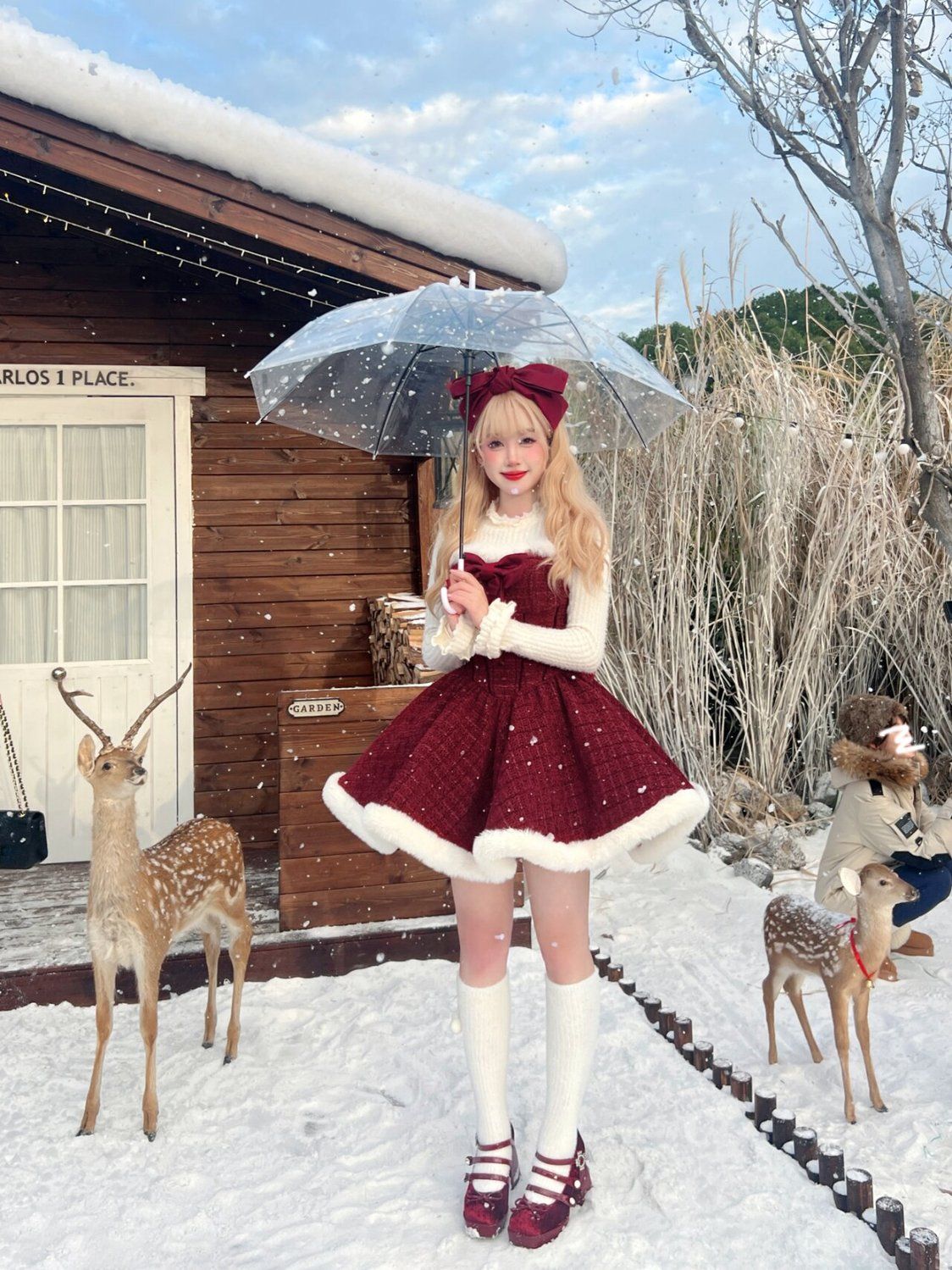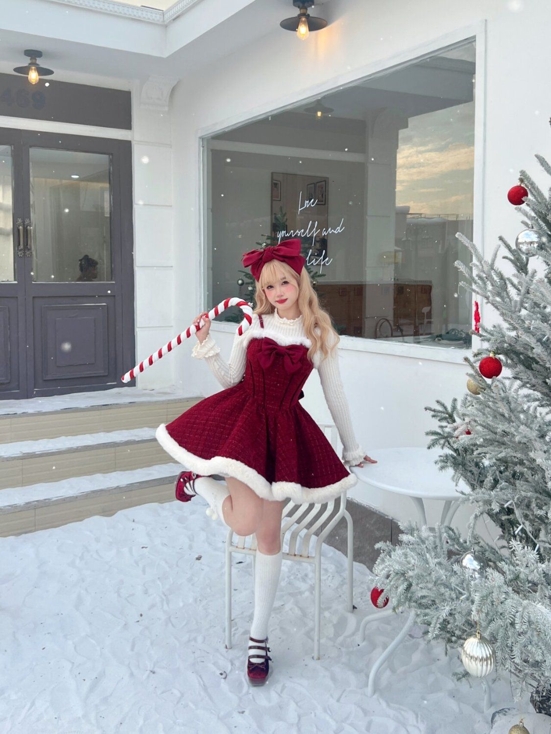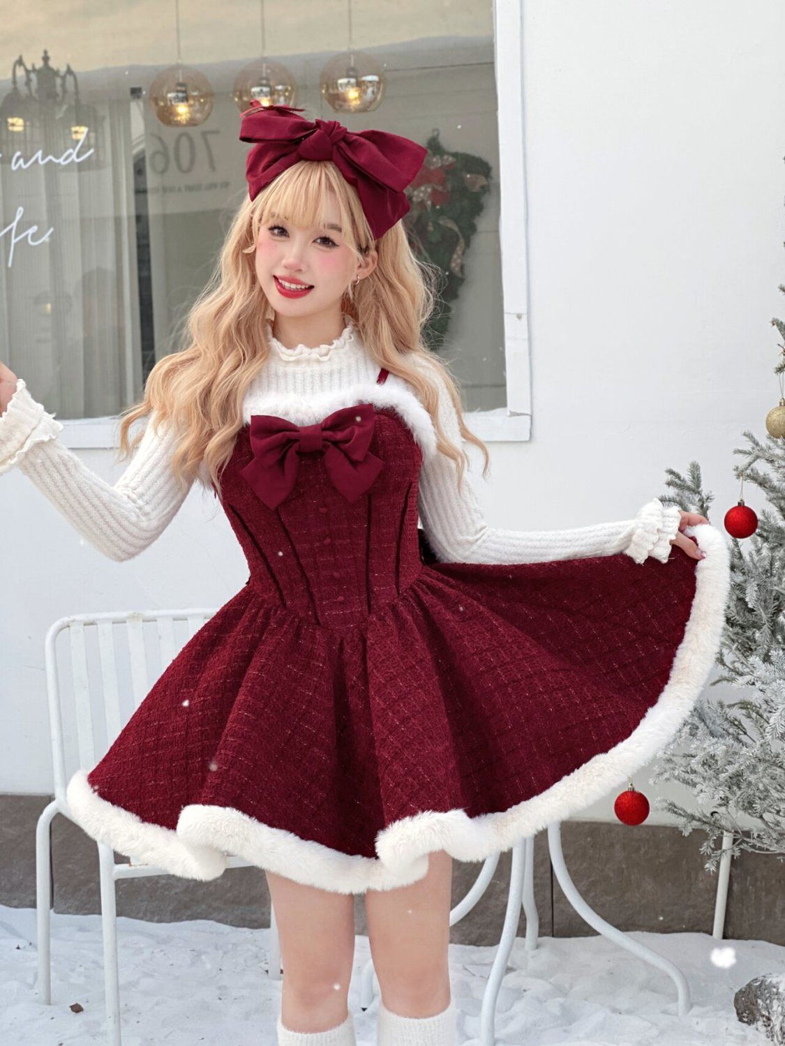 2024 秋 冬 韓国ファッション サンタコス クリスマス セット ロリータ レッド 蝶ネクタイ ポンチョ ジャケット キャミソールドレス コスチューム