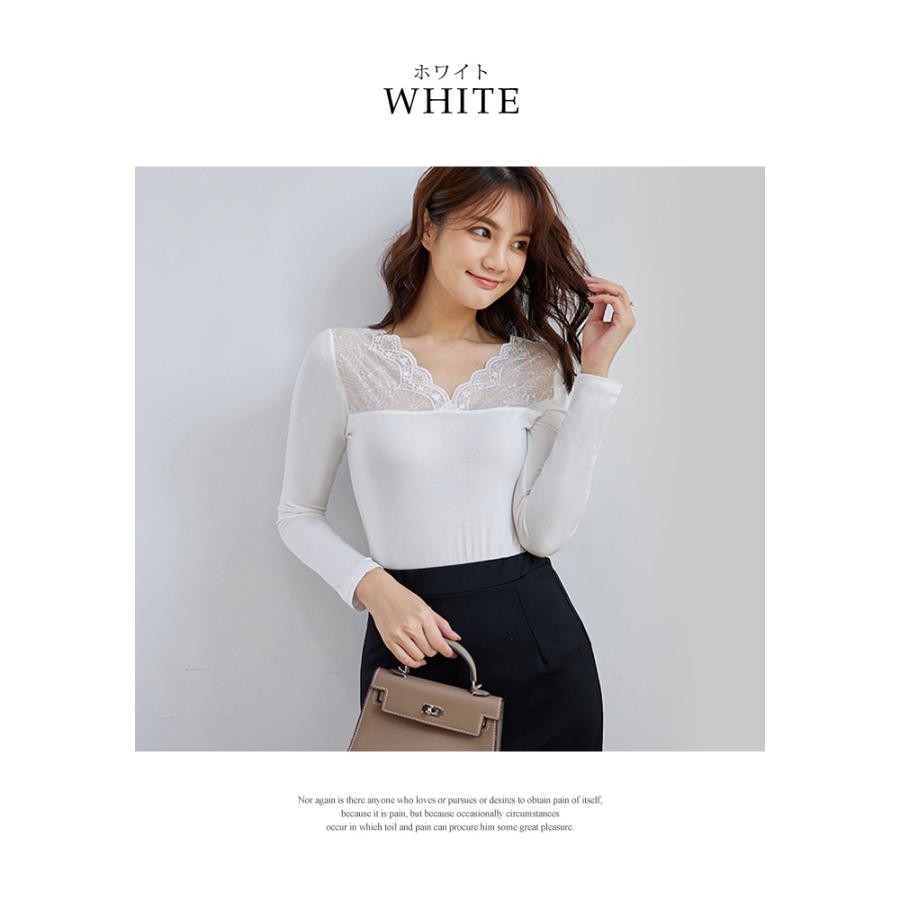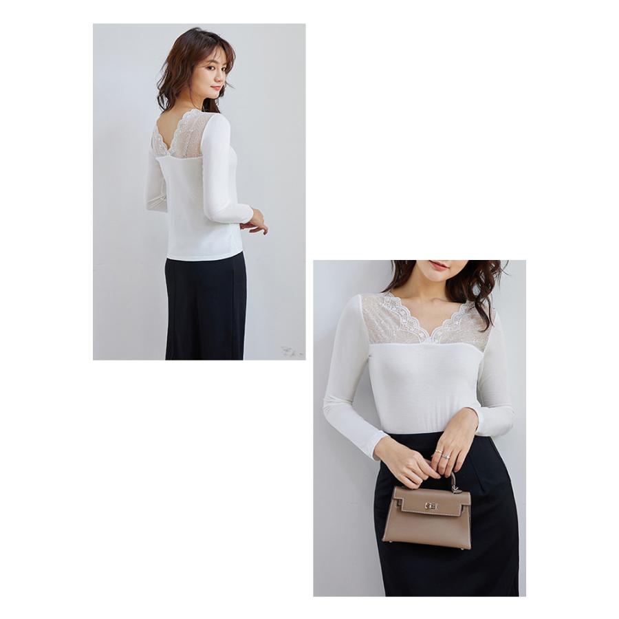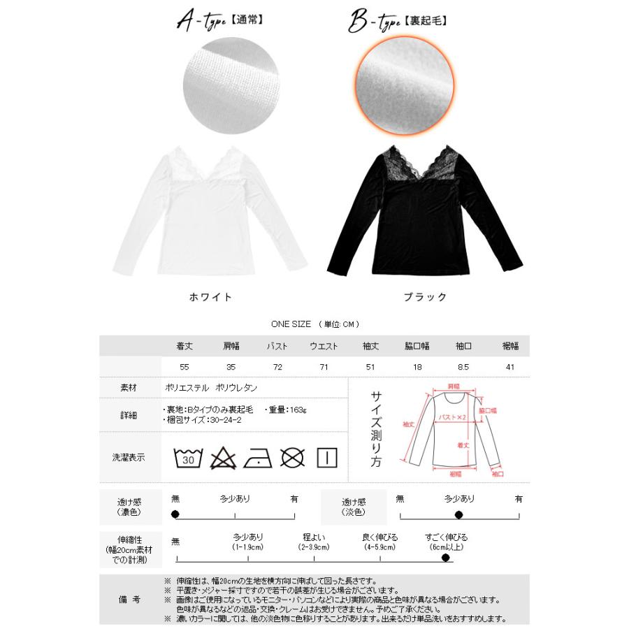 トップス レディース 秋 冬 秋冬 黒 白 裏起毛 カットソー 長袖 インナー 下着 あったか レースインナー Vネック インナー 無地 ブラック ホワイト