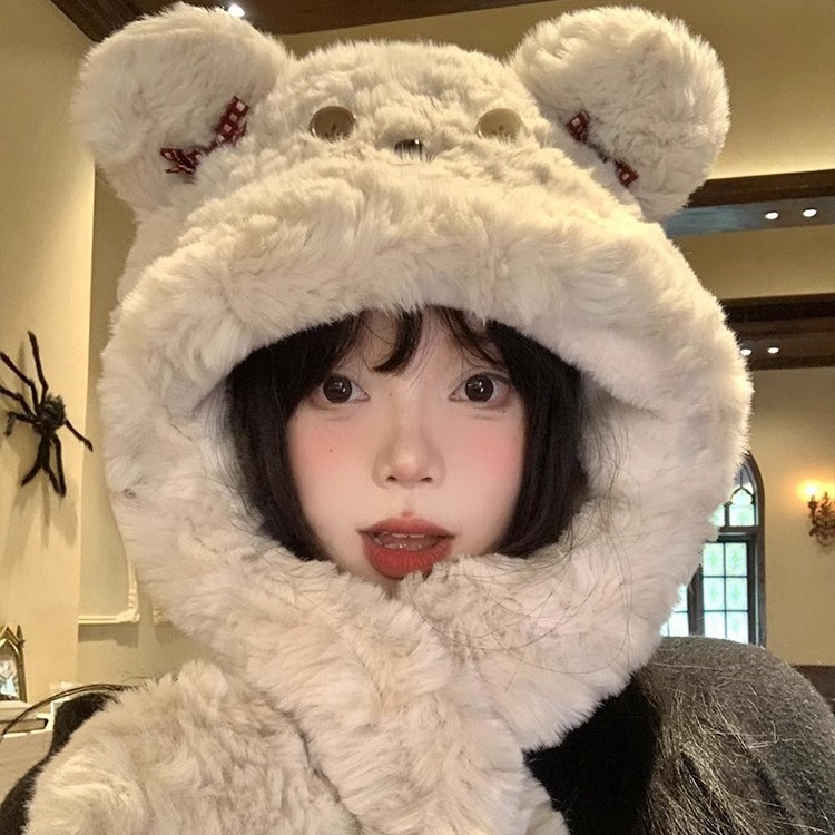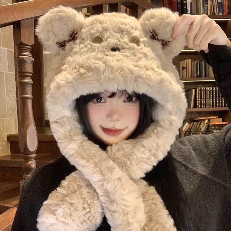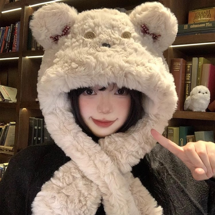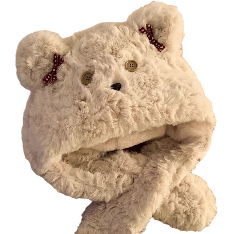 冬用の可愛いボタンつきの小熊モチーフの加わった毛が厚いカートゥーンなモヘア帽で暖かい保温性に優れた帽子でどんなコーディネートにもマッチします
