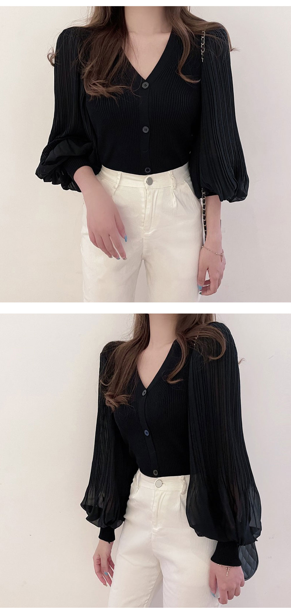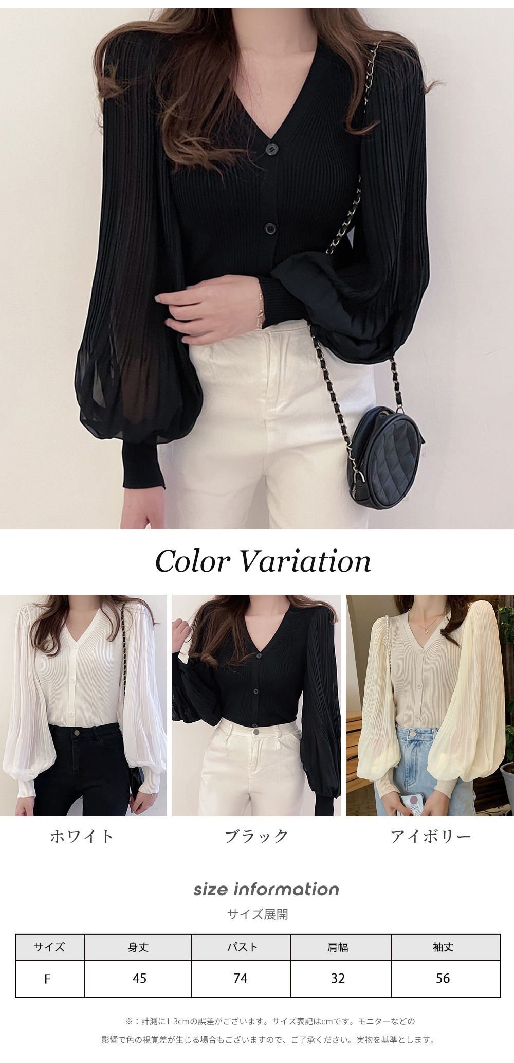 春 秋 長袖 ブラウス ニット ドッキング トップス レディース 切り替え シアー袖 ボリューム袖 レイヤード風 重ね着風 ニットトップス プルオーバー 薄手 ボタン