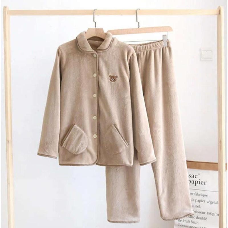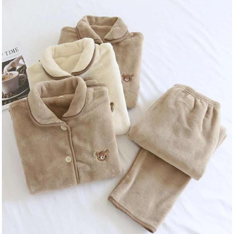 ペア パジャマ レディース メンズ ルームウェア 可愛いクマ柄 上下セット カップル 婦人用 紳士用 秋冬 防寒 ふわふわ もこもこ 前開き 厚手 長袖