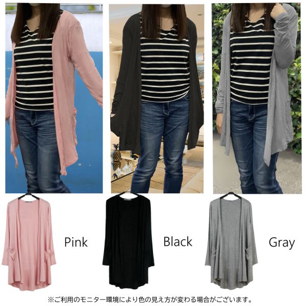 ロング カーディガン ブラック グレー ピンク トッパー シンプル ヒップ丈 冷房 紫外線対策 ブラック グレー ピンク カーディガン
