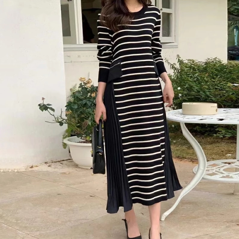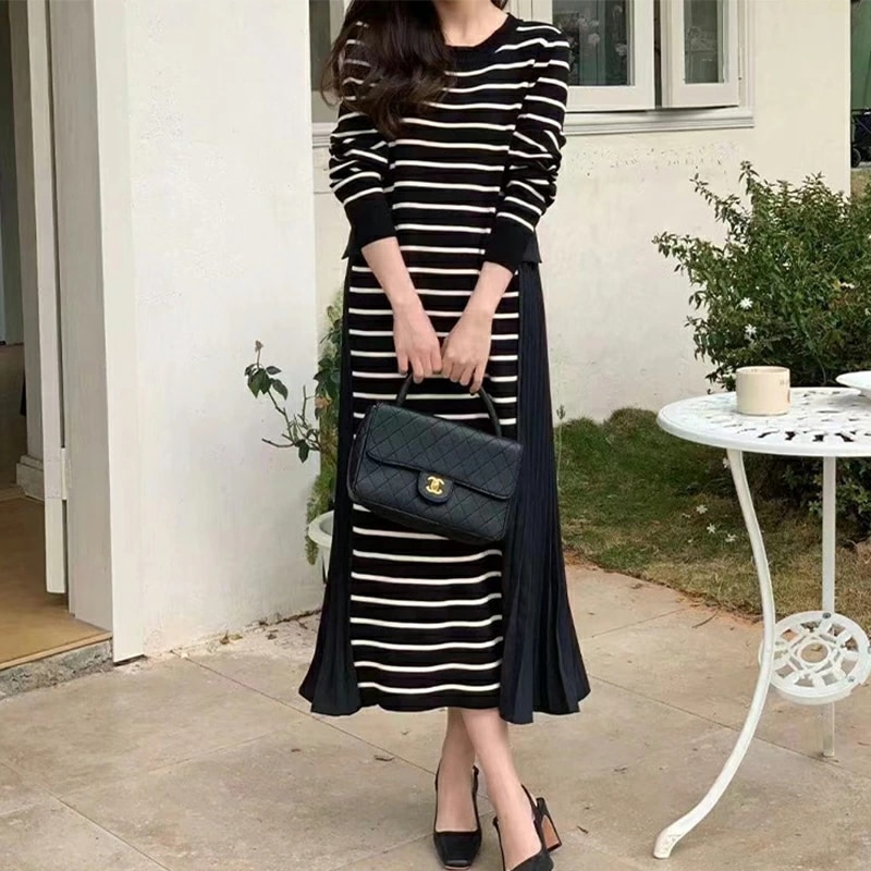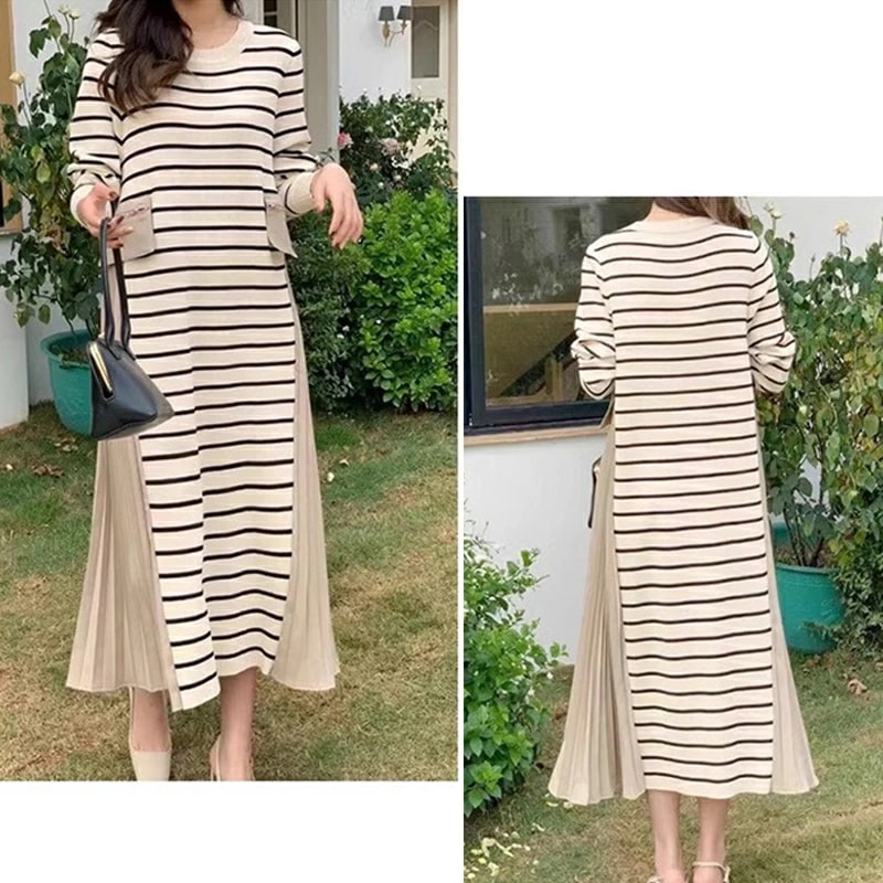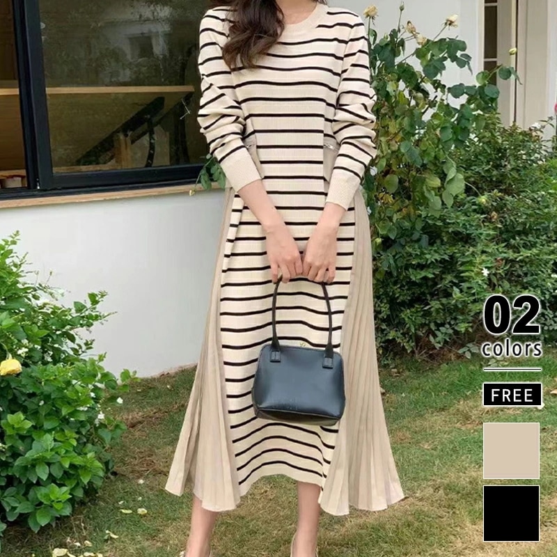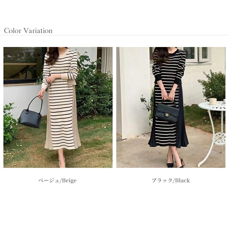 ボーダーワンピース プリーツ切り替え ニットワンピース ワンピース ボーダー 切り替え プリーツ ロング 長袖 レディース ニット ロングワンピース ドッキング aライン