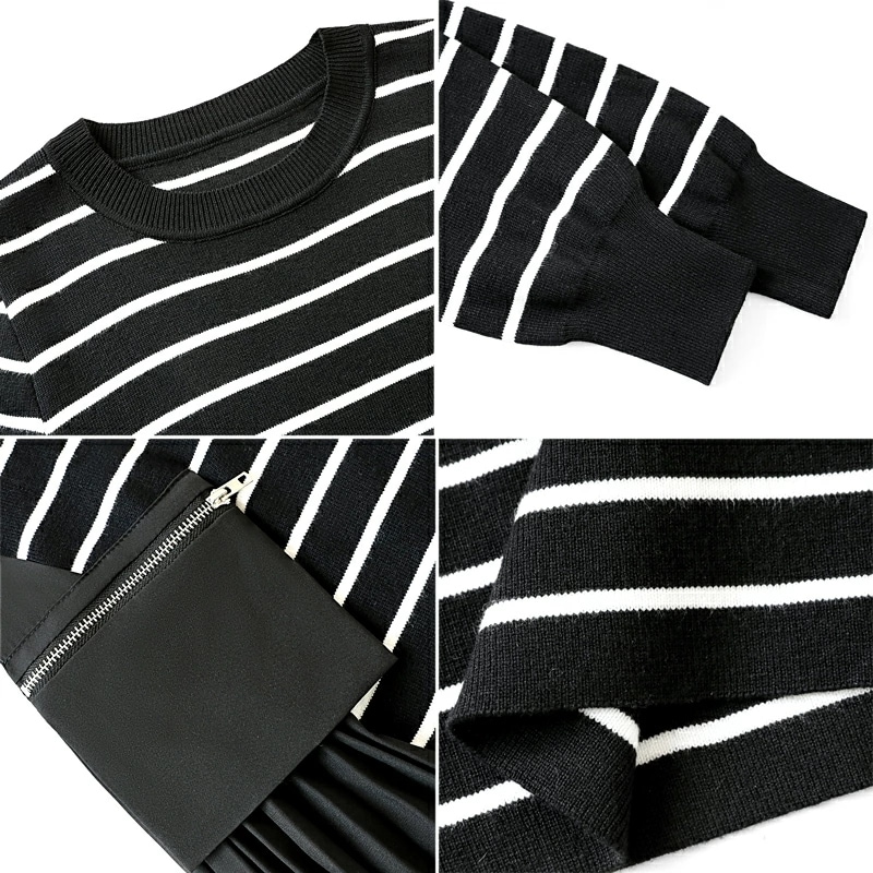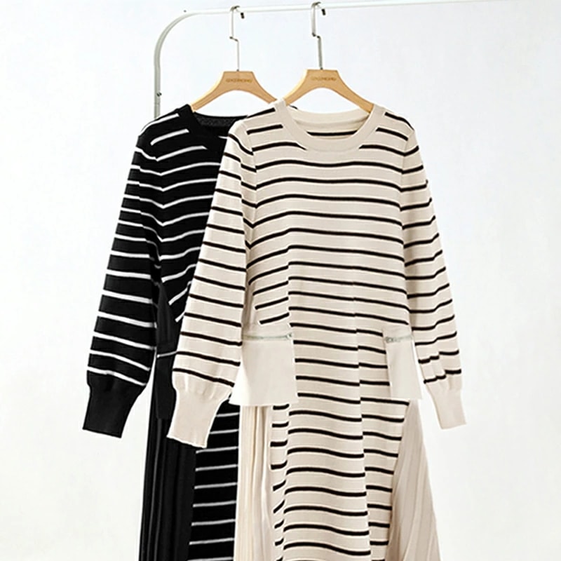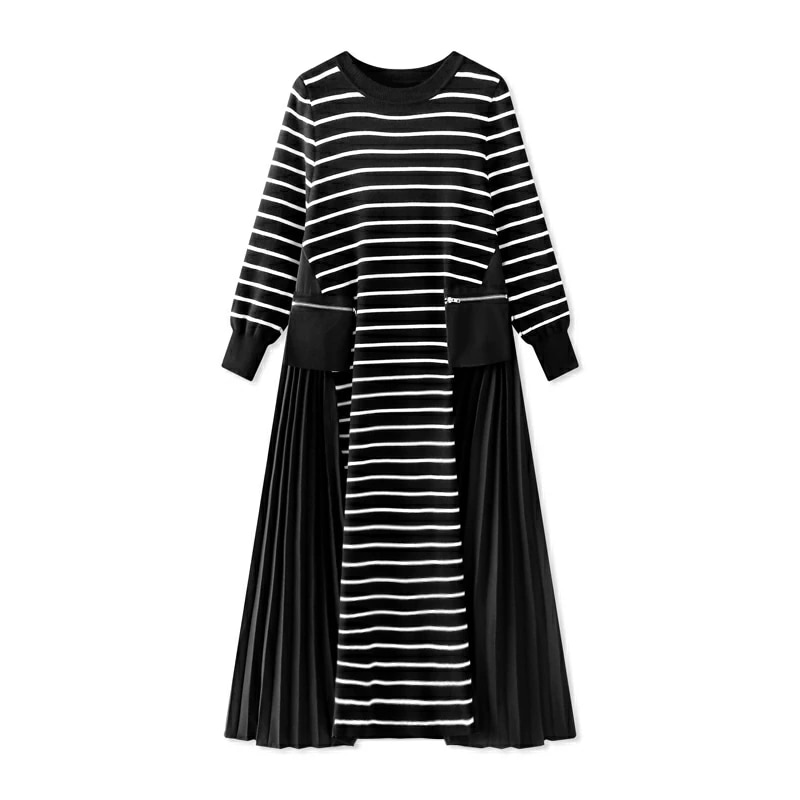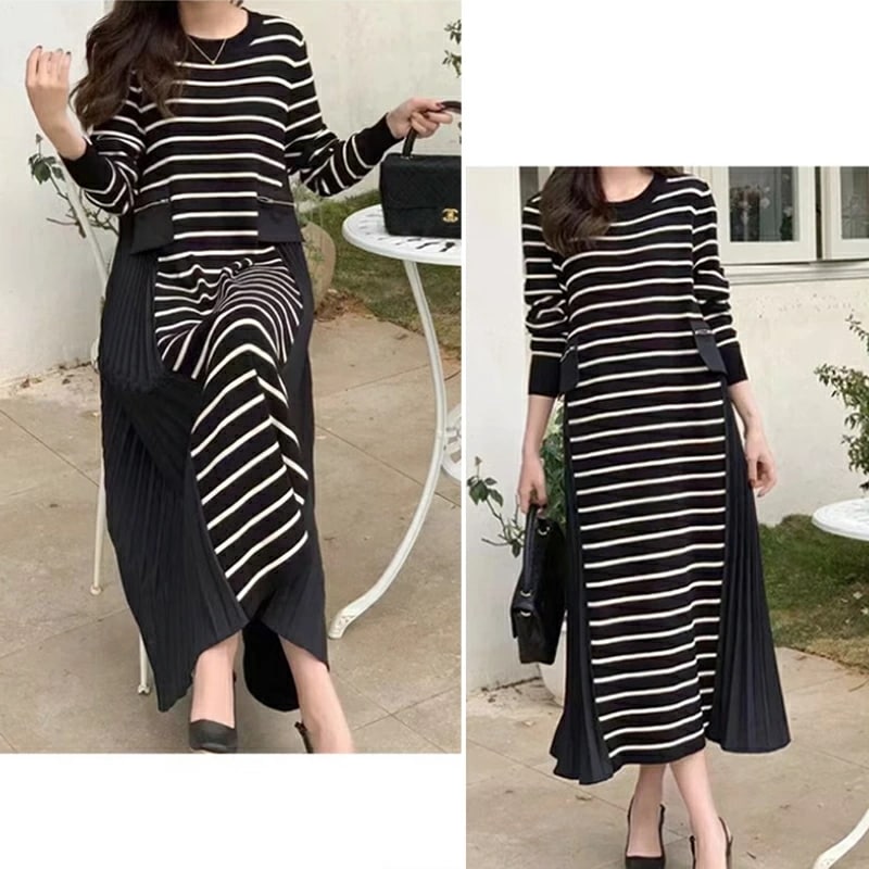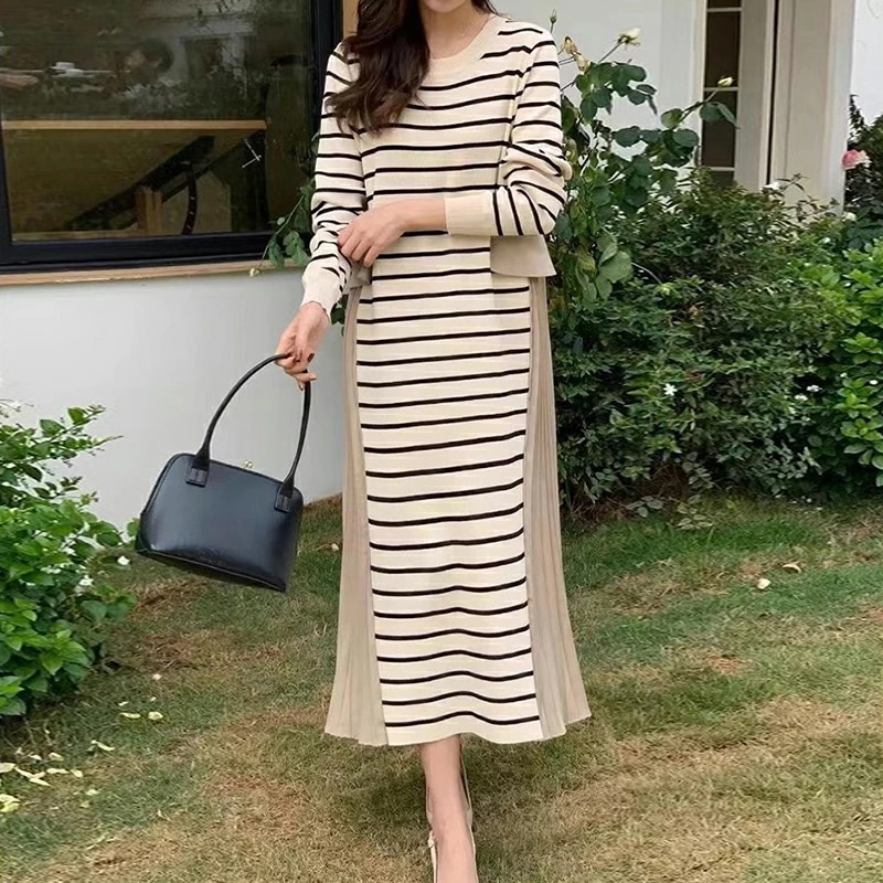 ボーダーワンピース プリーツ切り替え ニットワンピース ワンピース ボーダー 切り替え プリーツ ロング 長袖 レディース ニット ロングワンピース ドッキング aライン