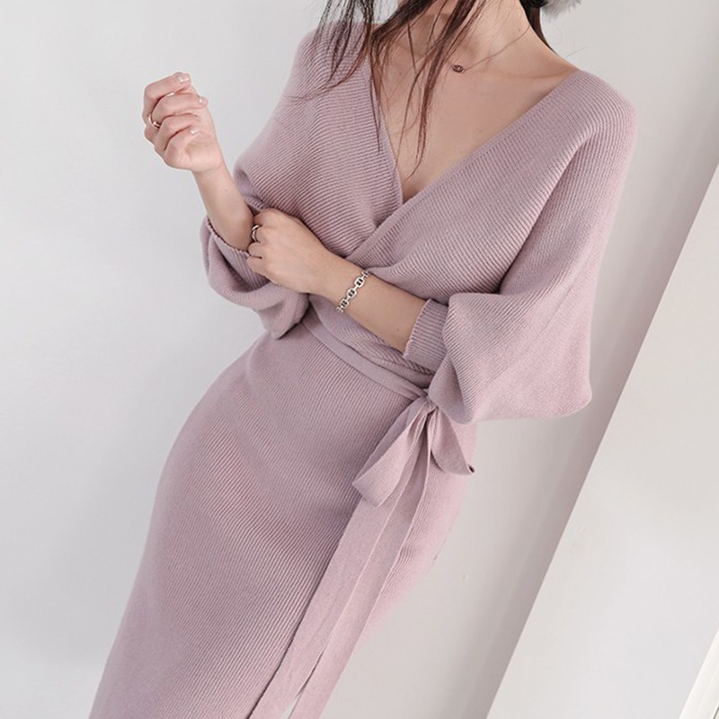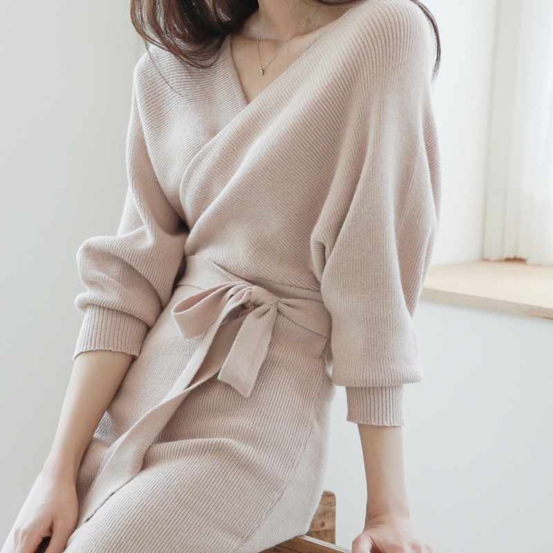 ニットドレス ワンピース パーティードレス 韓国ファッション セクシーなニットドレス2024新しい秋のファッション気質vネックストラップセータースカート