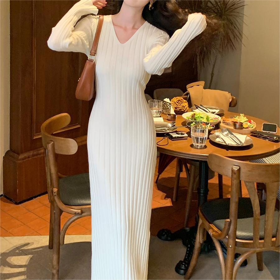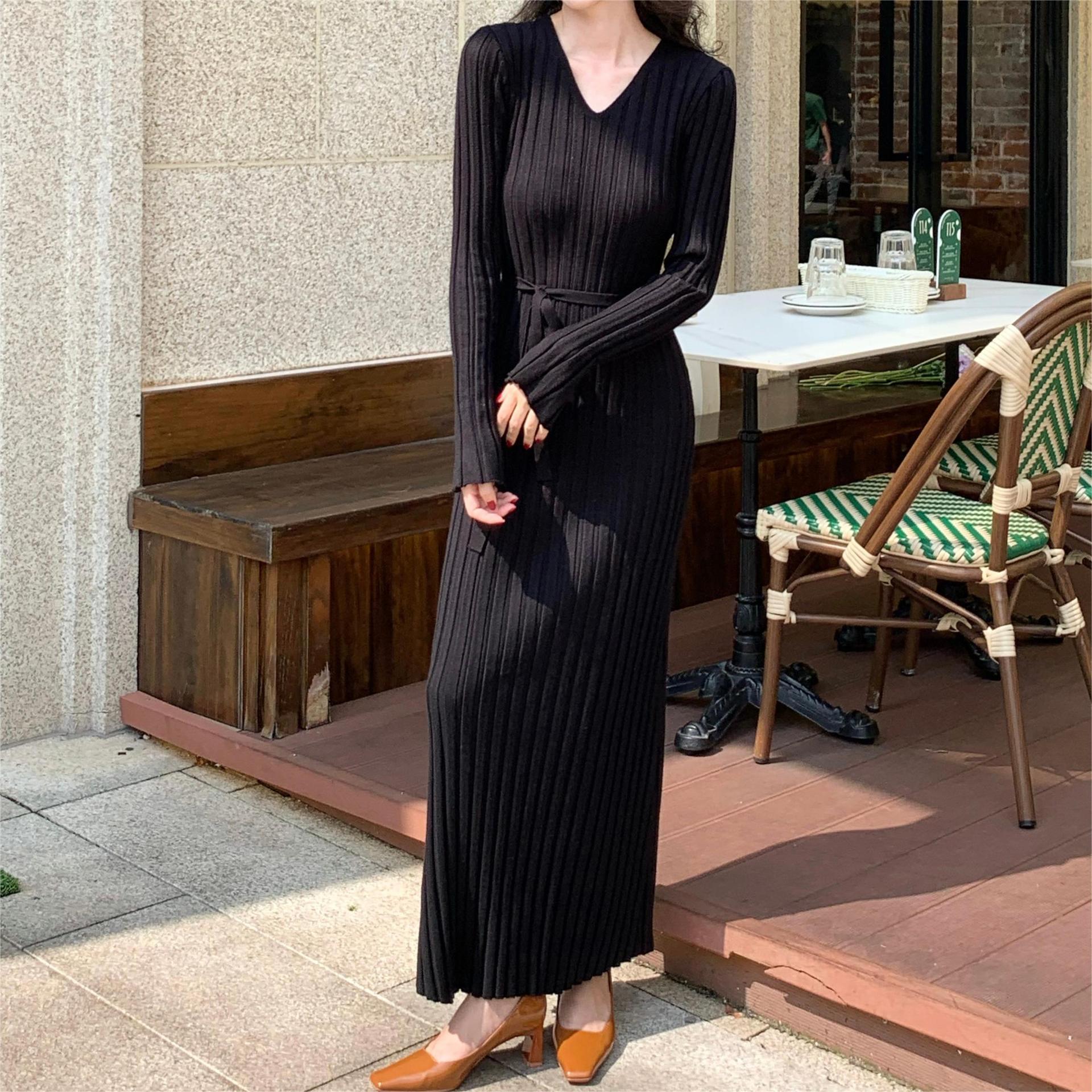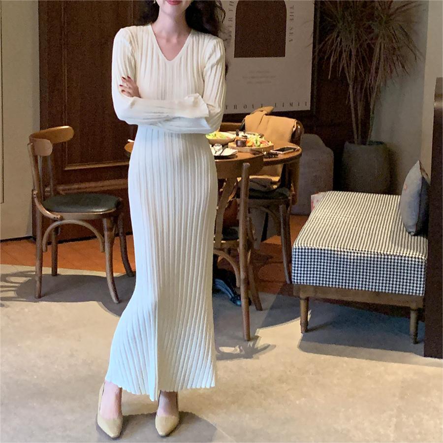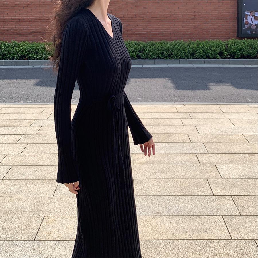 ニットドレス ワンピース パーティードレス 韓国ファッション 韓国無地 V ネックニットドレス女性 2024 秋冬新スタイルストラップウエストシンプルセータースカート