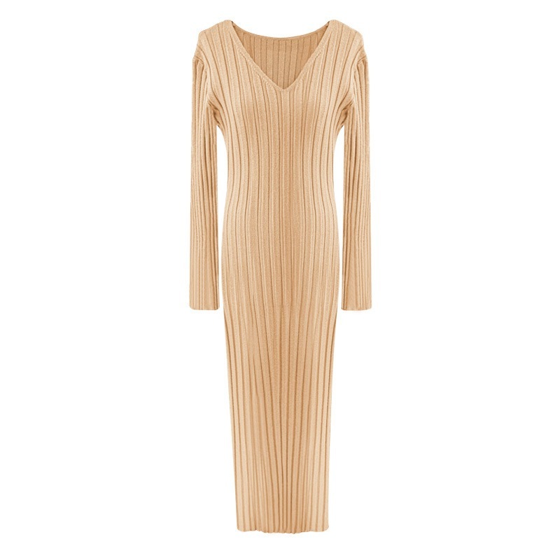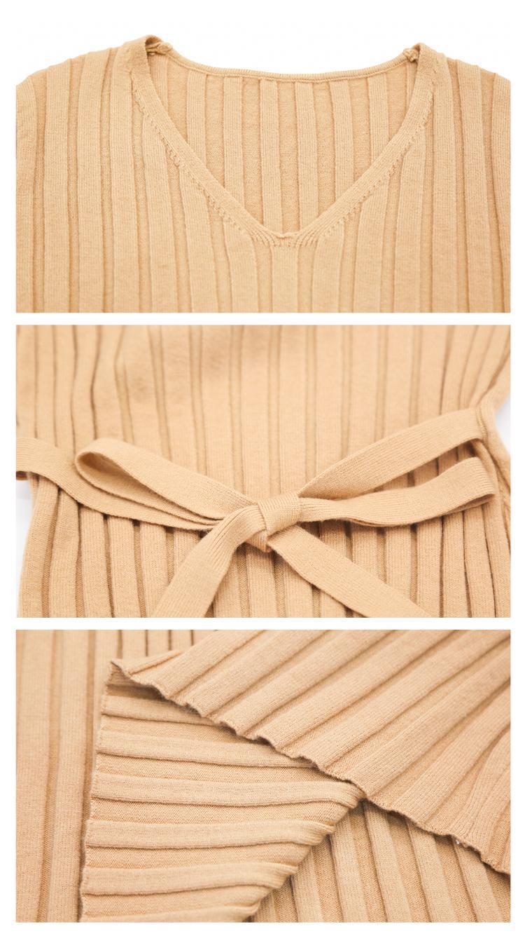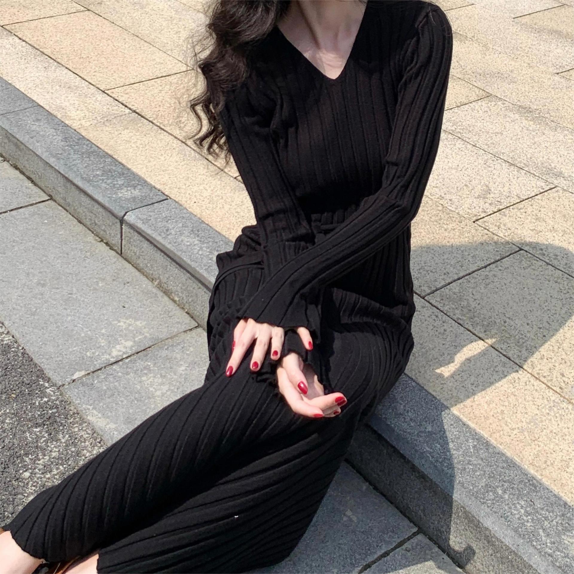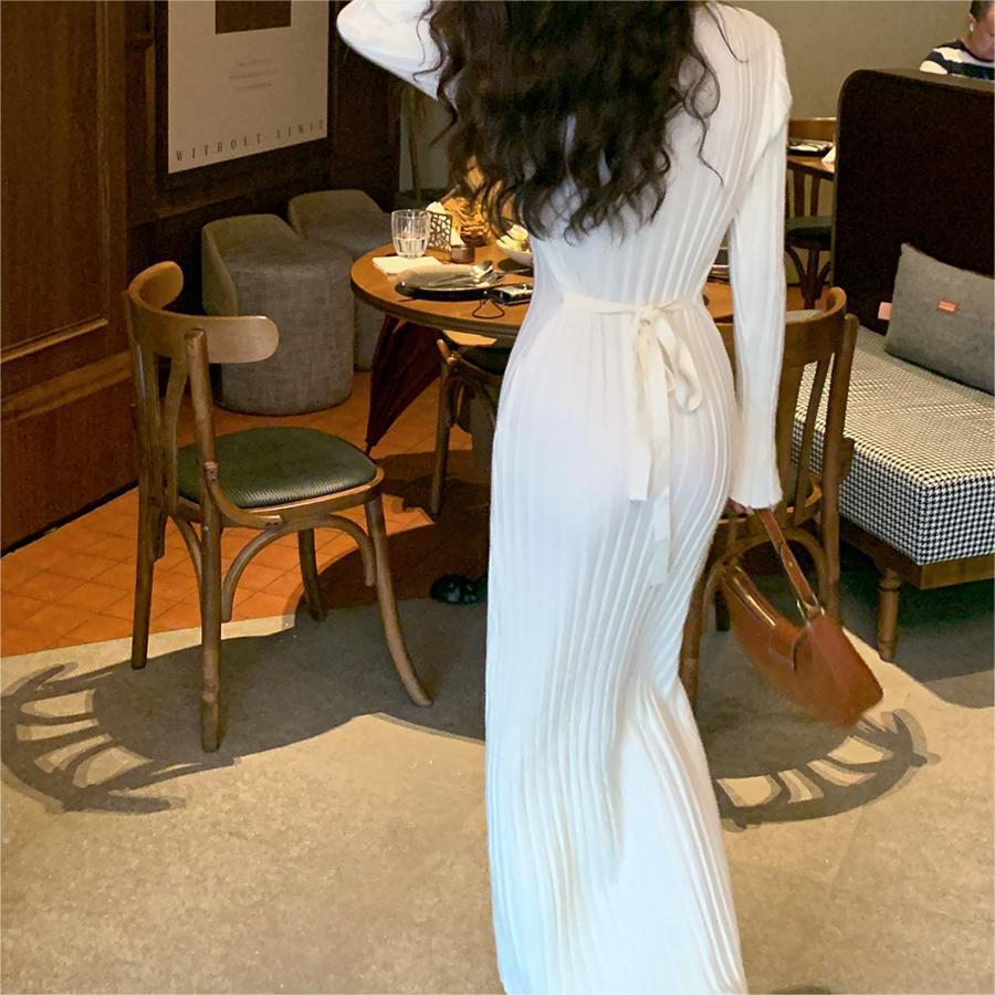 ニットドレス ワンピース パーティードレス 韓国ファッション 韓国無地 V ネックニットドレス女性 2024 秋冬新スタイルストラップウエストシンプルセータースカート