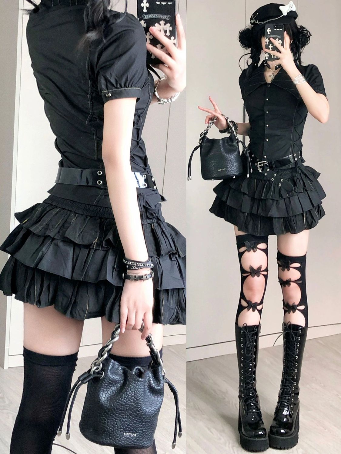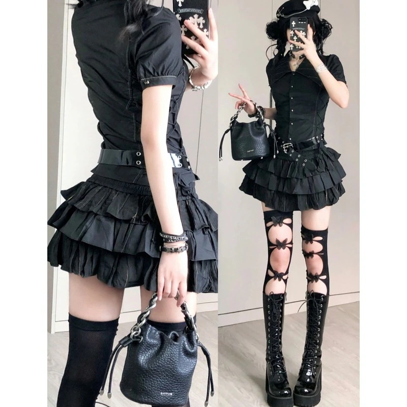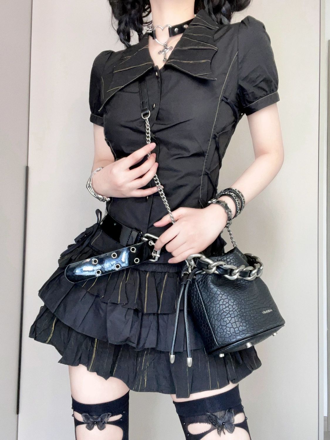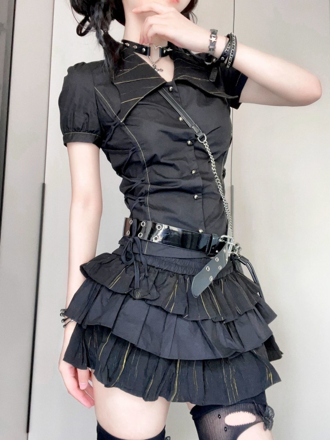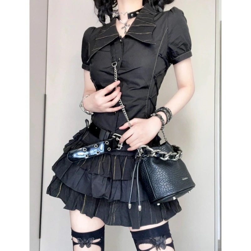 涼しく楽ちんセットアップパンク風ダーク系バルーンスリーブスレンダーシャツ+百合気質プリーツスカート小人数スーツ女 セットアップ コスチューム