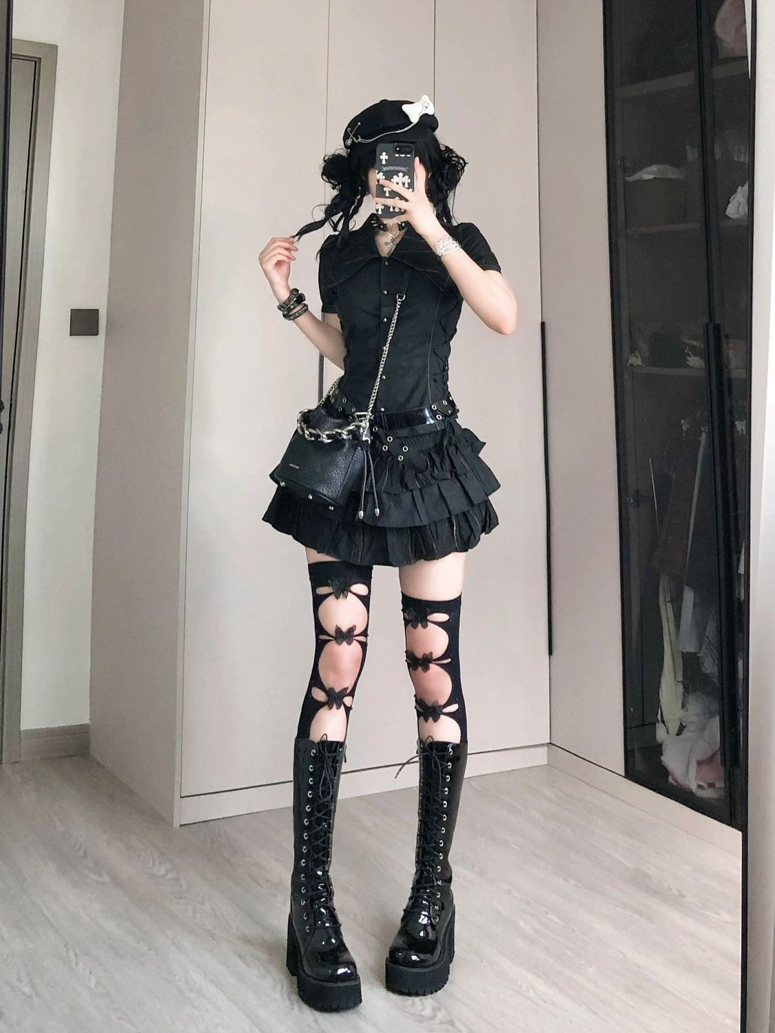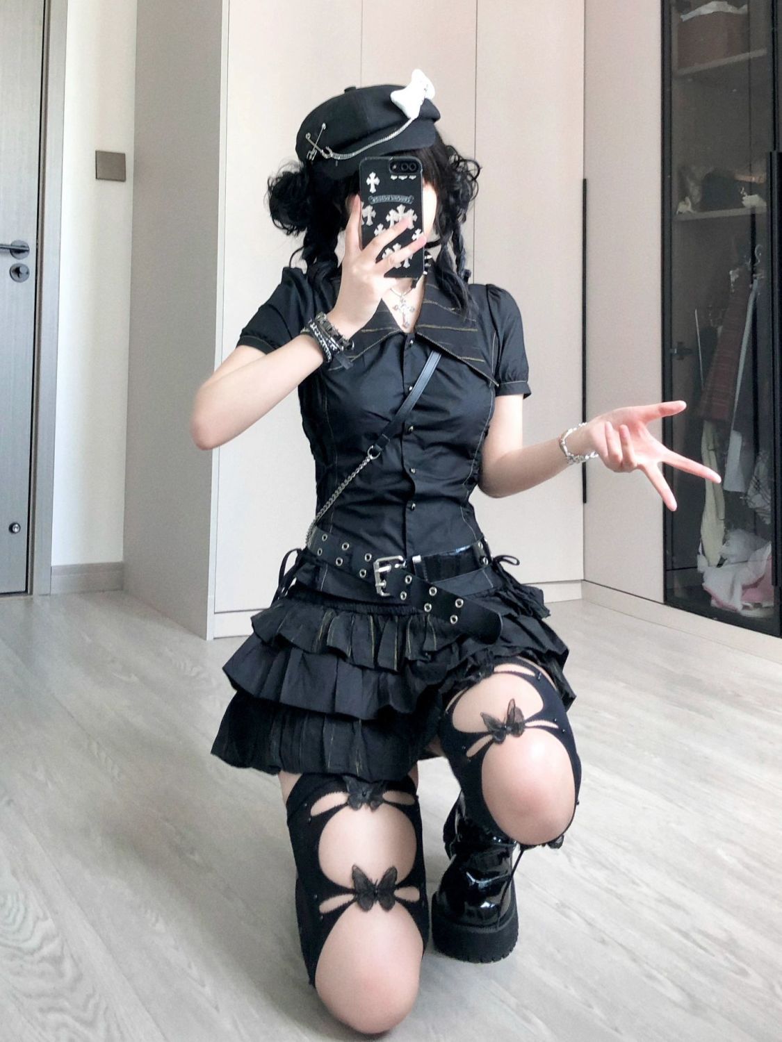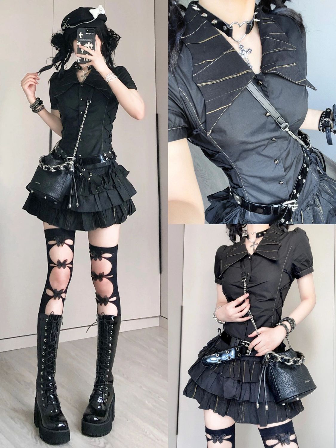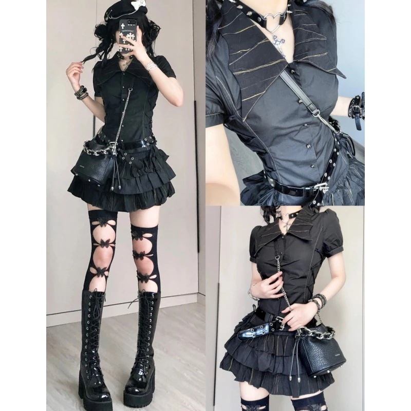 涼しく楽ちんセットアップパンク風ダーク系バルーンスリーブスレンダーシャツ+百合気質プリーツスカート小人数スーツ女 セットアップ コスチューム