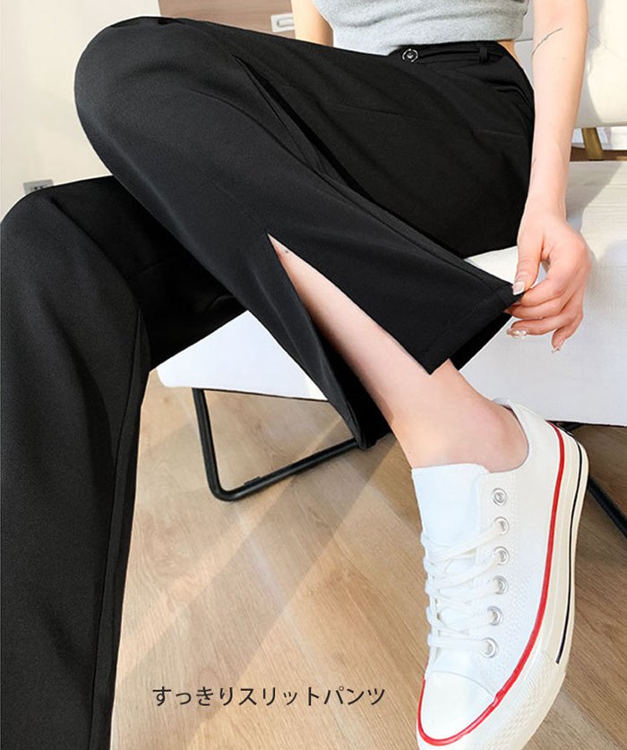 低身長 高身長 大きいサイズ有り テーパードパンツ スリットパンツ ピンタックパンツ センタープレス ストレッチ ボトムス ロング丈 レディーススラックス 無地 シンプル ウエストゴム オフィス