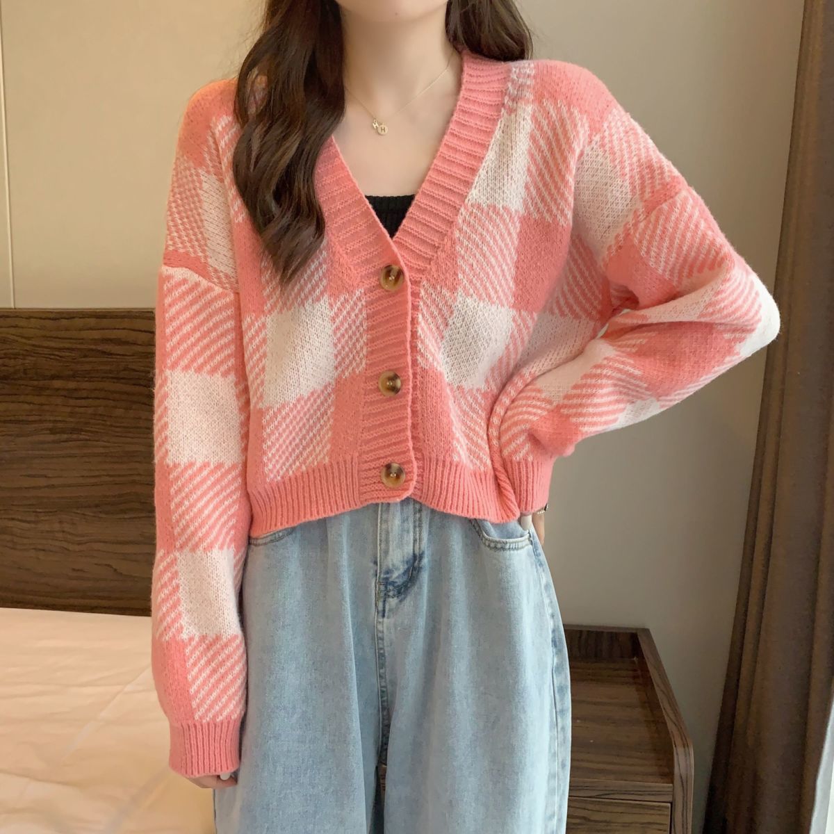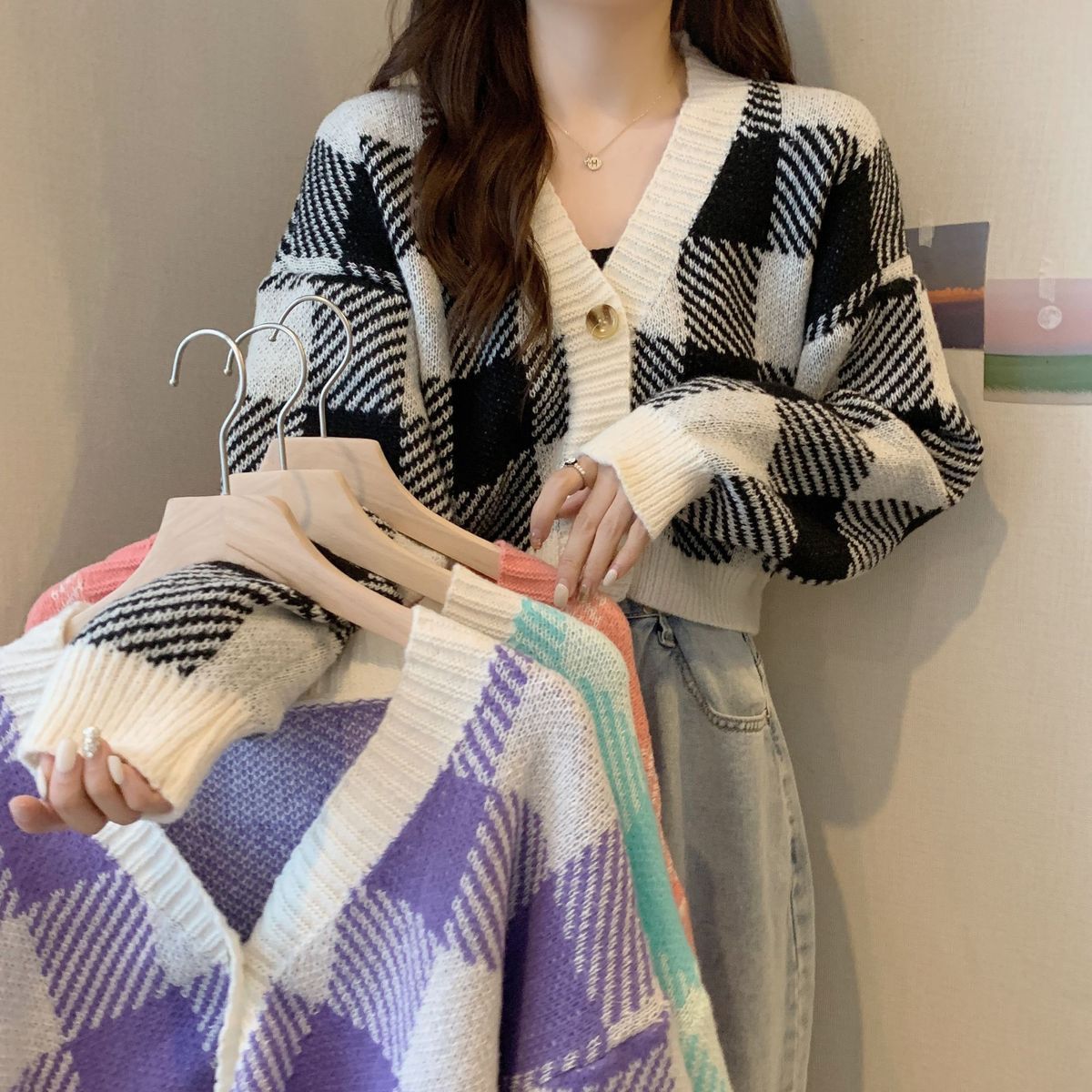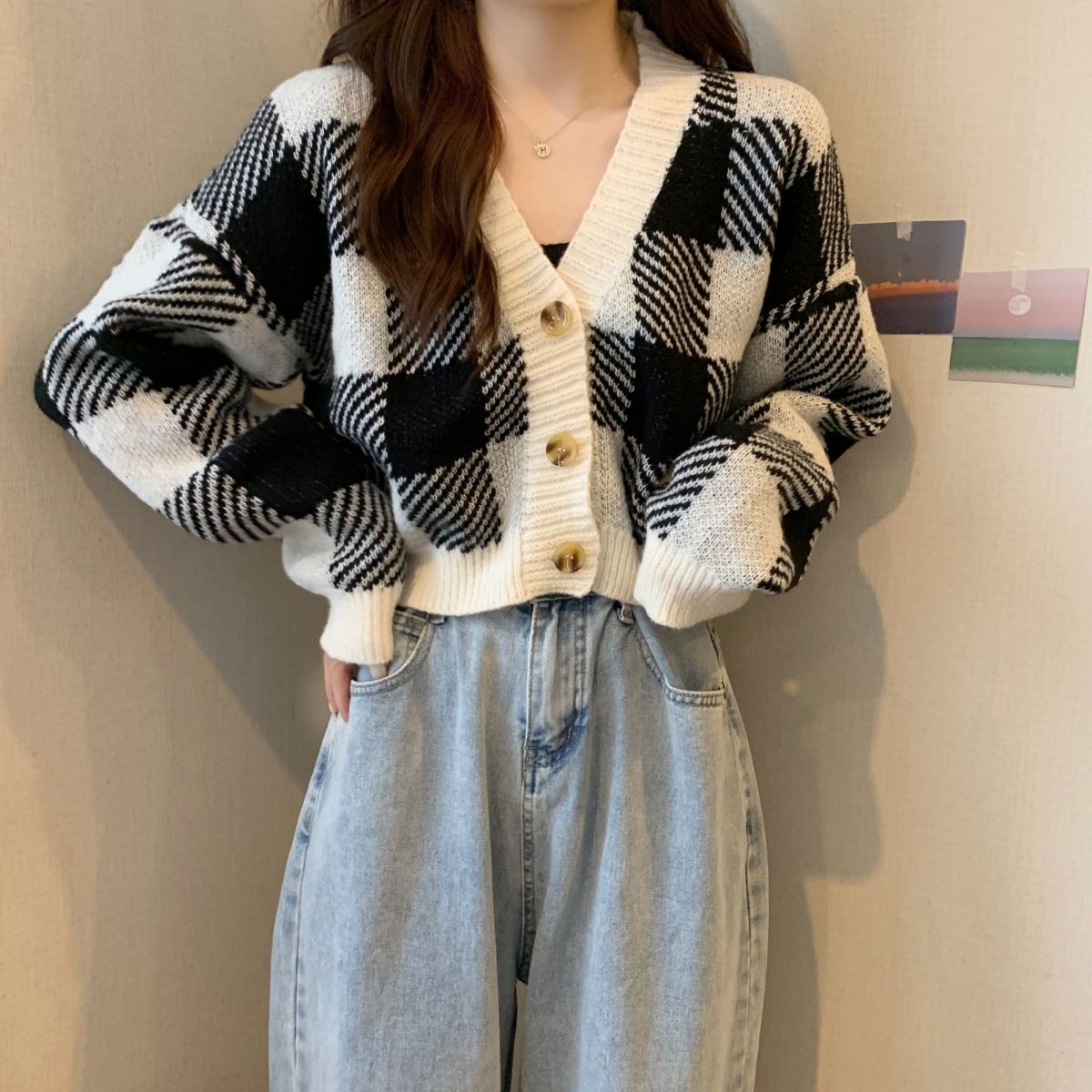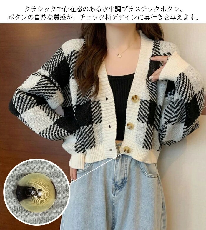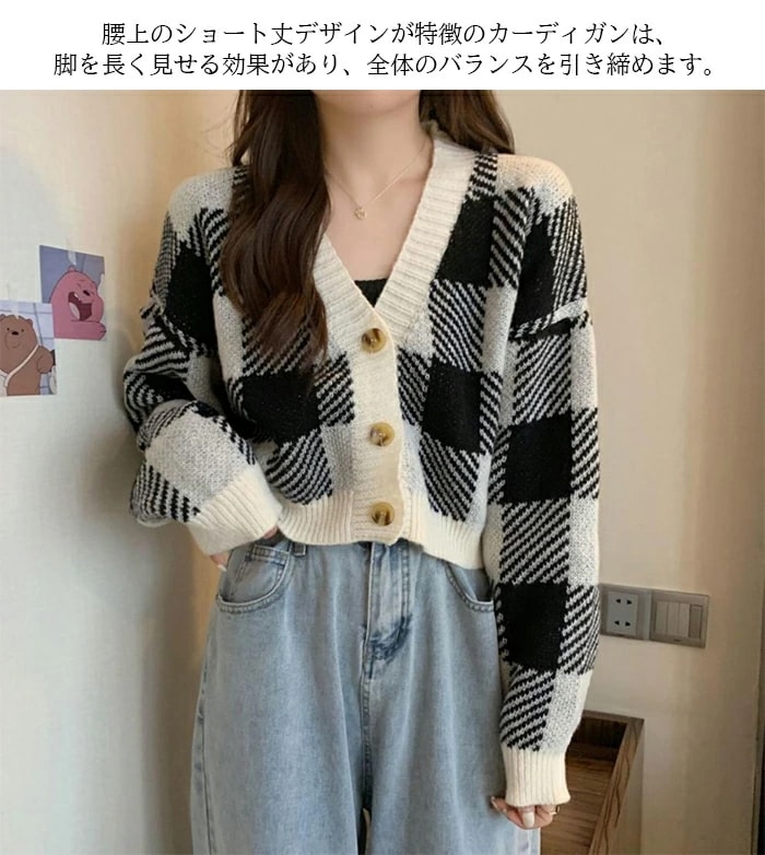 トップス ニットカーディガン レディース 秋冬 長袖 Vネックニット チェック柄 ボタン付き ゆったり 厚手 ショート丈 ふわふわ