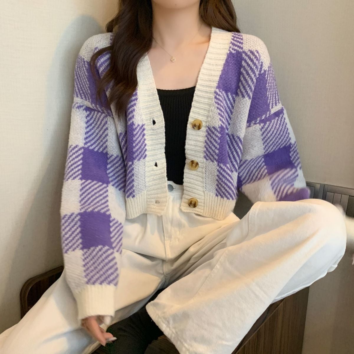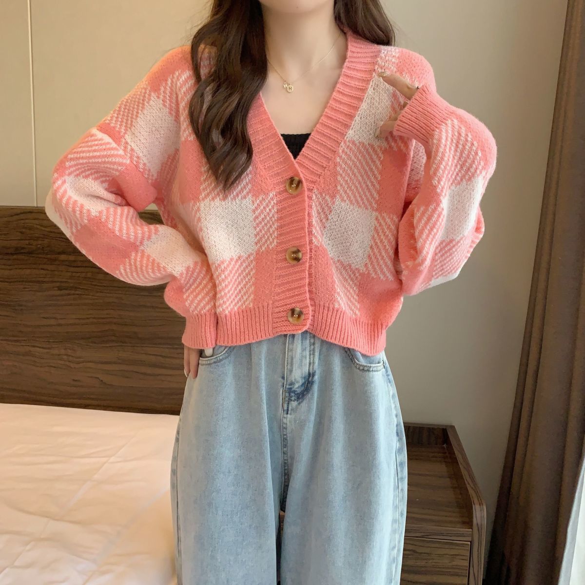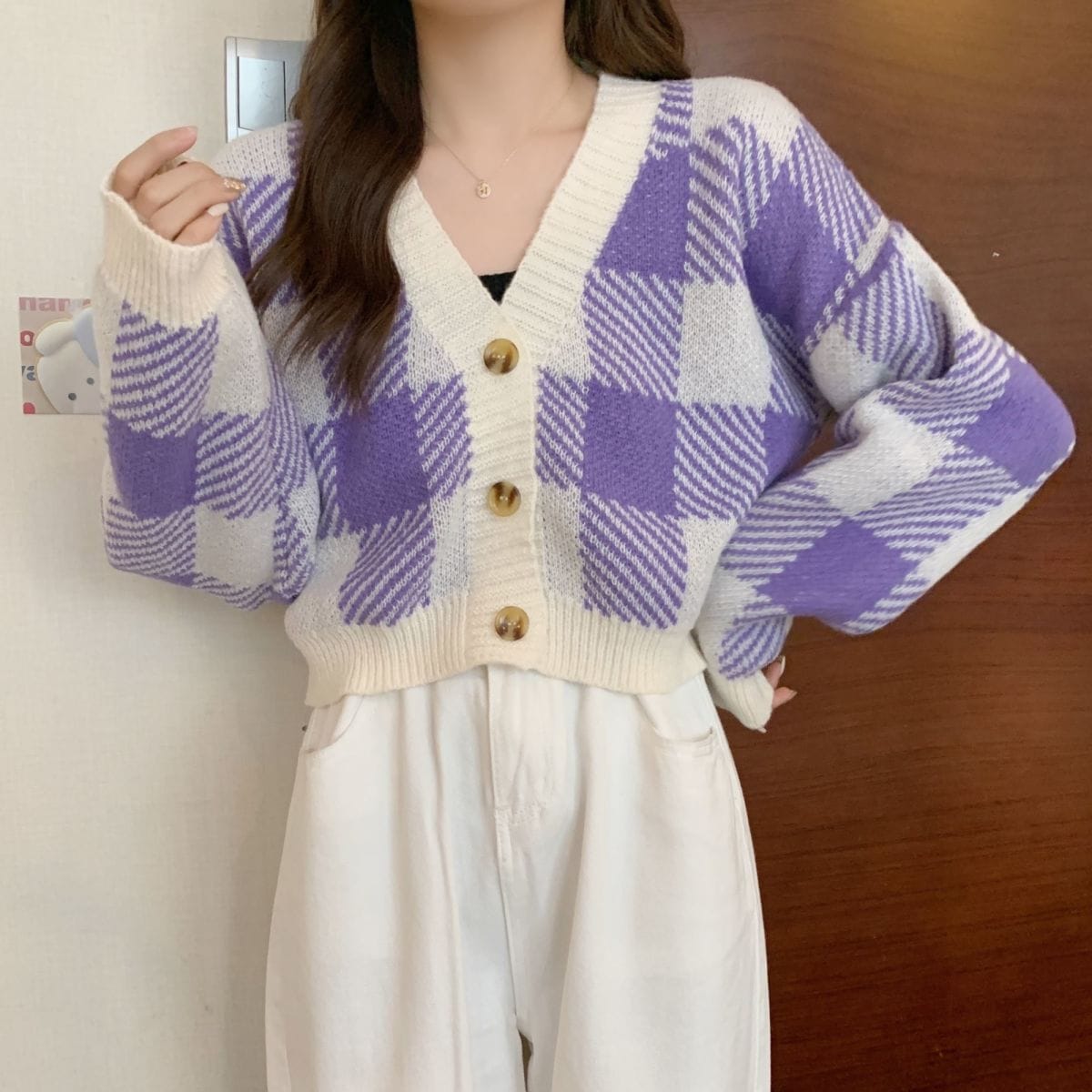 トップス ニットカーディガン レディース 秋冬 長袖 Vネックニット チェック柄 ボタン付き ゆったり 厚手 ショート丈 ふわふわ