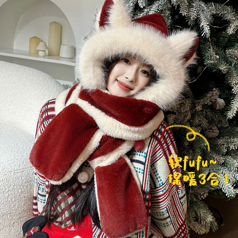 アンコラウールで作られた可愛いキツネ耳つきのモヘア帽子とスカラフがセットで冬用に加わった毛が厚く暖かい保温性なアイテムです 耳あて イヤーマフラー