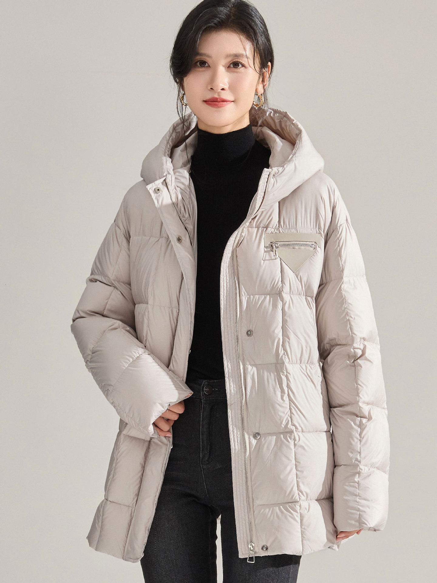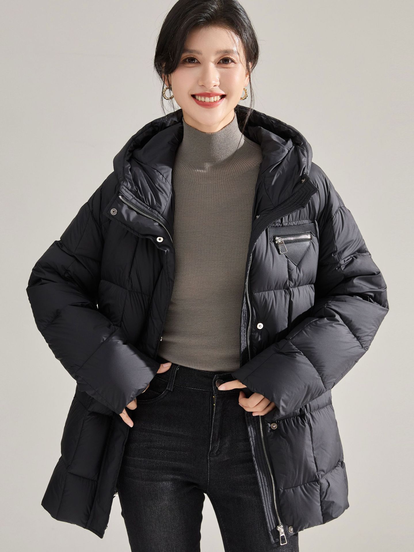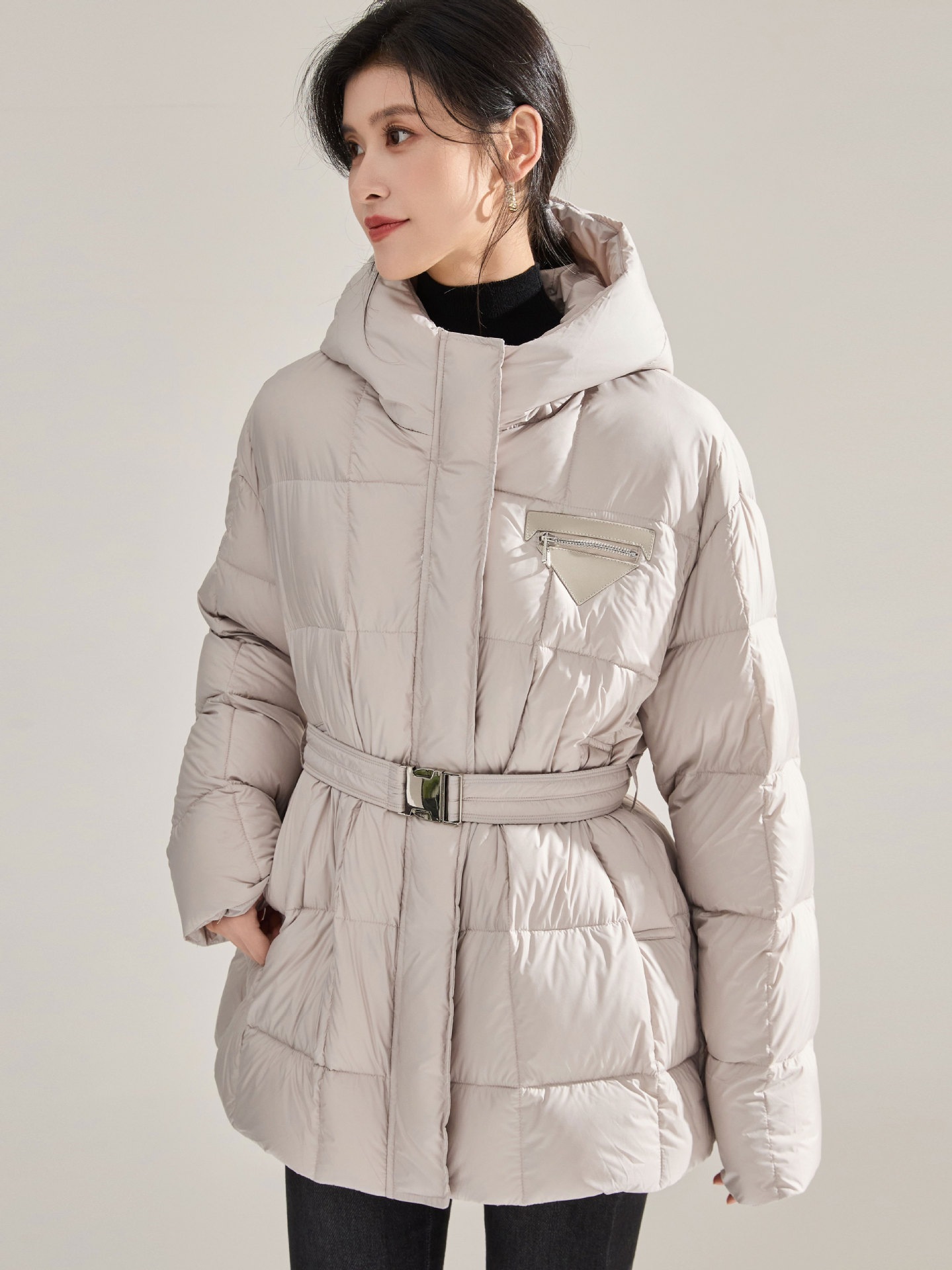 冬のふわふわ高い熱三角形のラベルのウエストはフード付きの長い片手90の白いダックのダウンジャケットを細くする ダウンジャケット コート