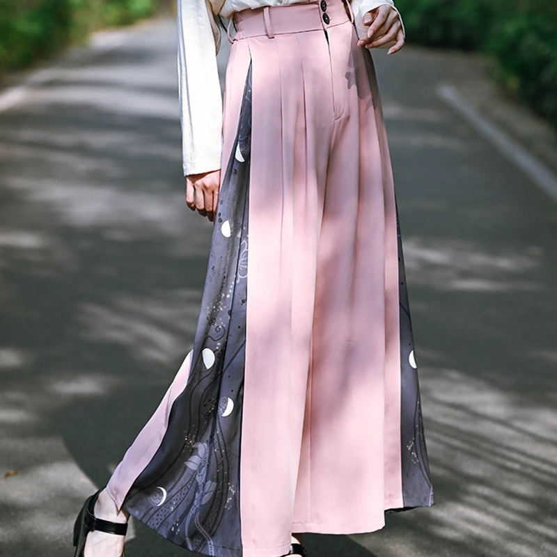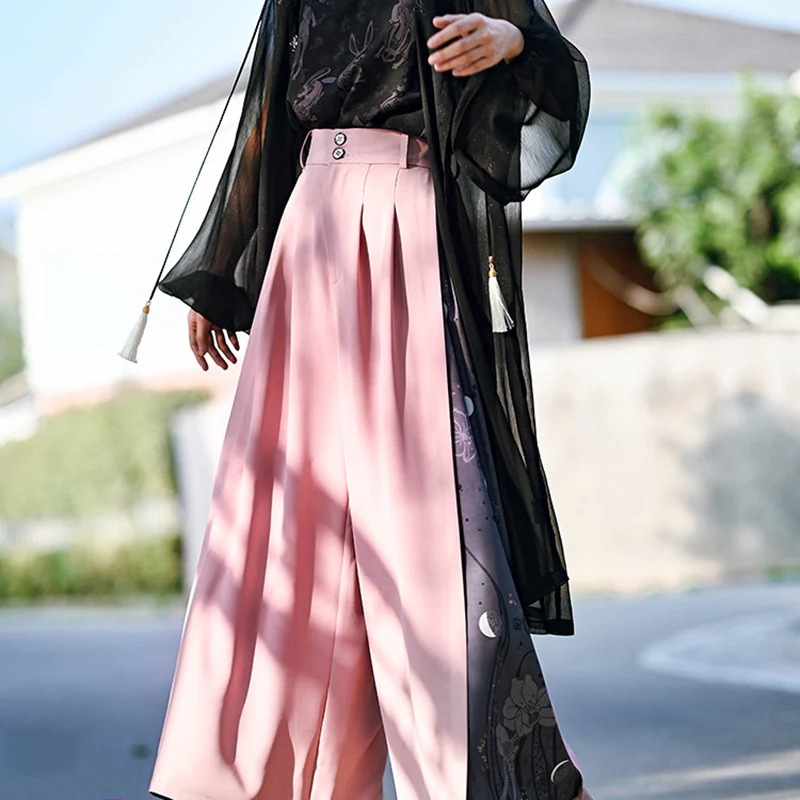 チャイナ風 ワイドパンツ レディース 柄パンツ 切り替え ボトムス ハイウエストズボン 黒 ピンク ロングパンツ