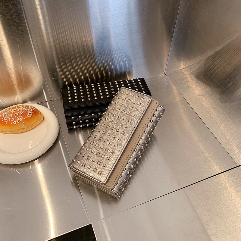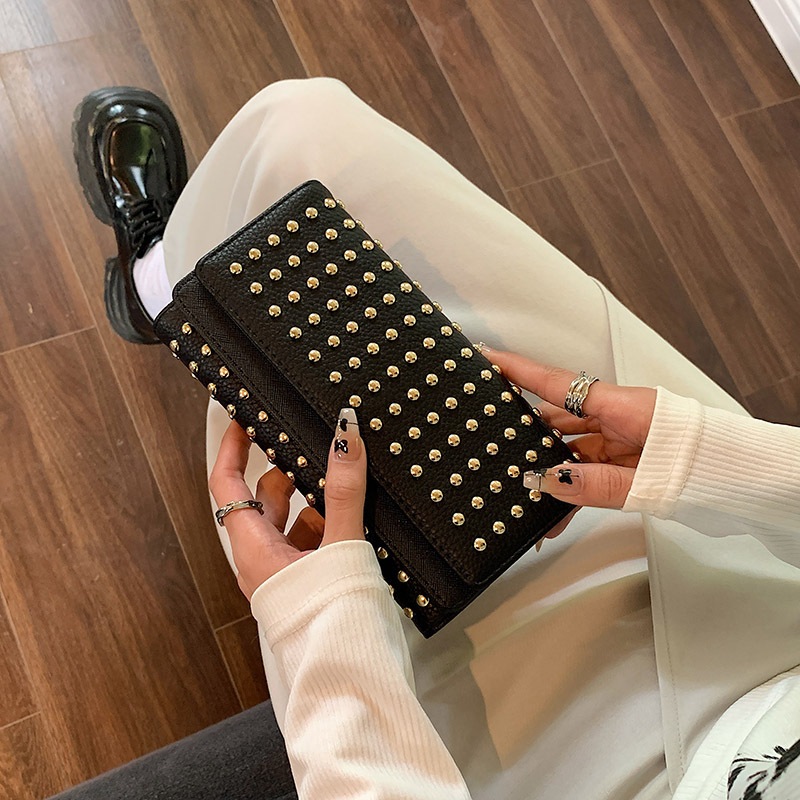 2024新型リベット三つ折りハンドバッグ女性用ハンドバッグロングジッパーゼロ財布大容量コインカードバッグ クラッチバッグ