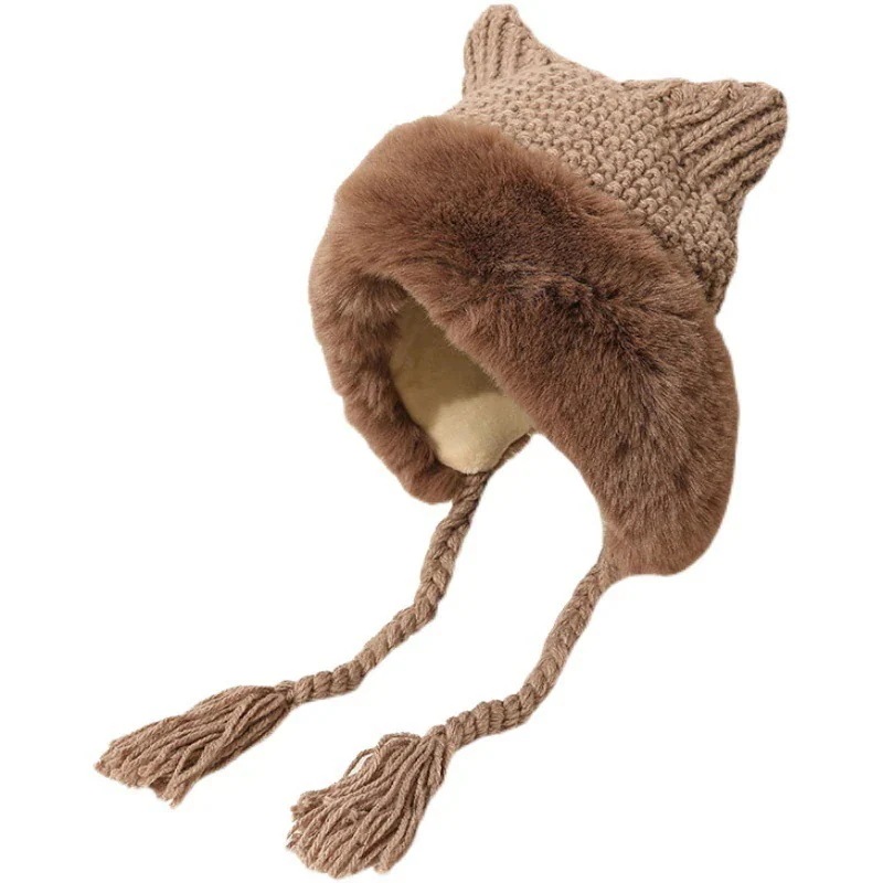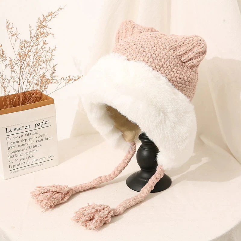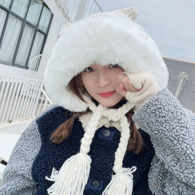 耳ガードおさげのモコモコ優しい女の子可愛い 女優帽 クリスマス レディースファッション 冬 防寒 猫耳 ニット 韓国 秋 帽子 ニット帽 暖かい