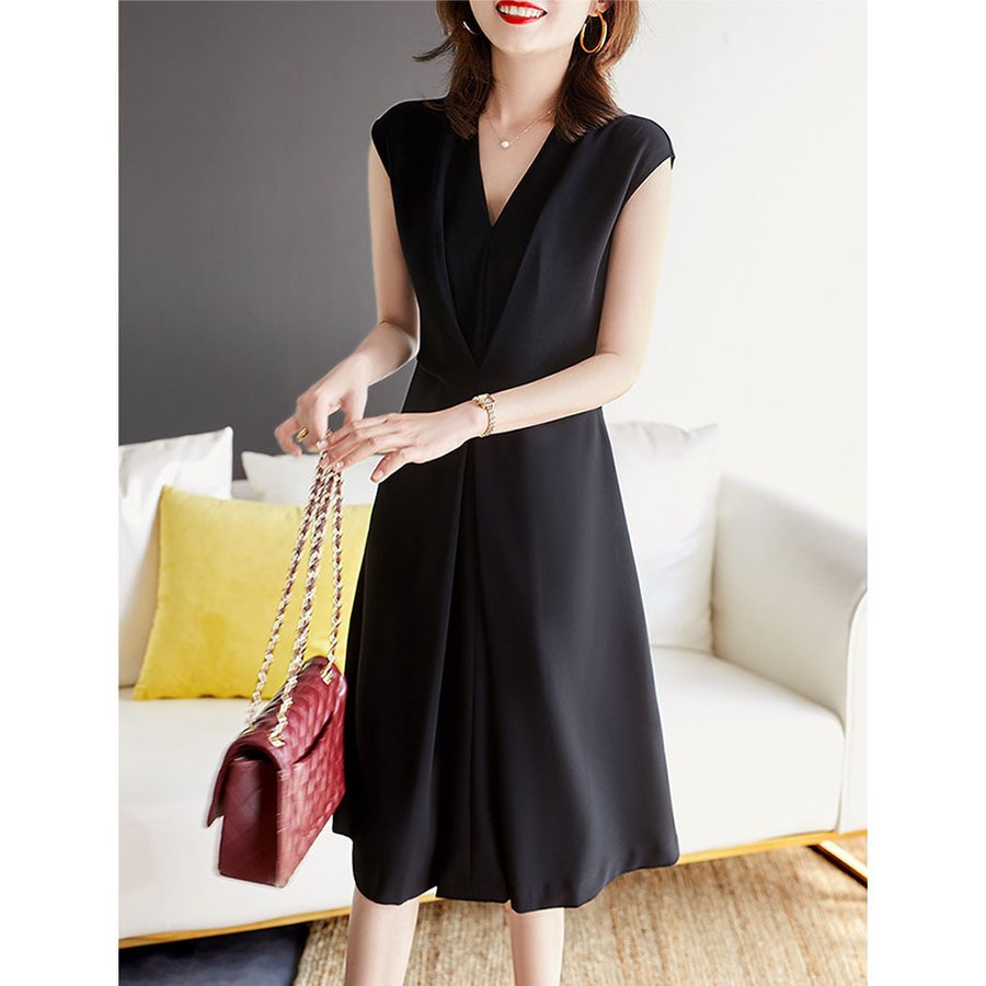 ワンピース レディース 春夏 40代 きれいめ マキシワンピース 半袖ワンピース 黒 vネック Aラインスカート オシャレ 大人 ゆったり 通勤 OL 韓国風 30代 50代