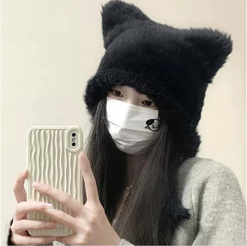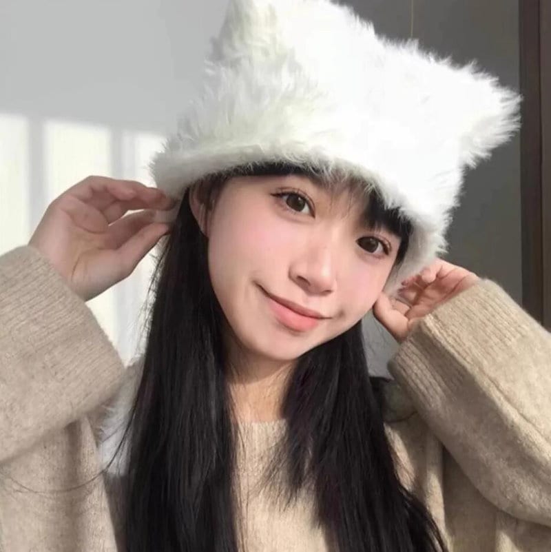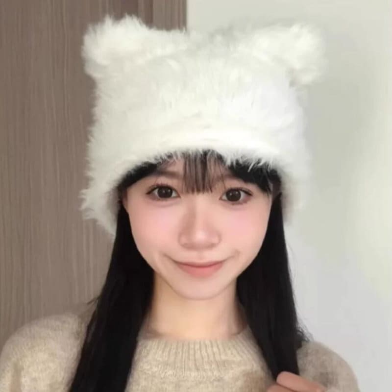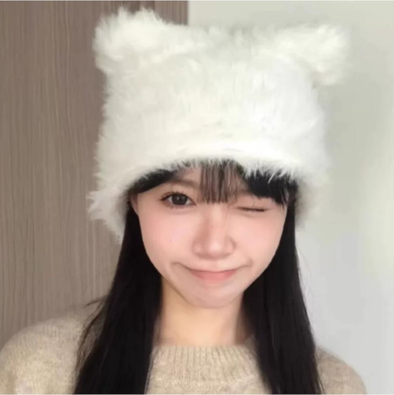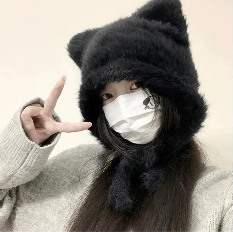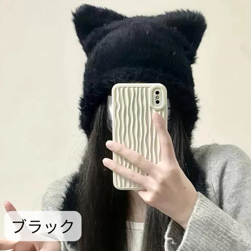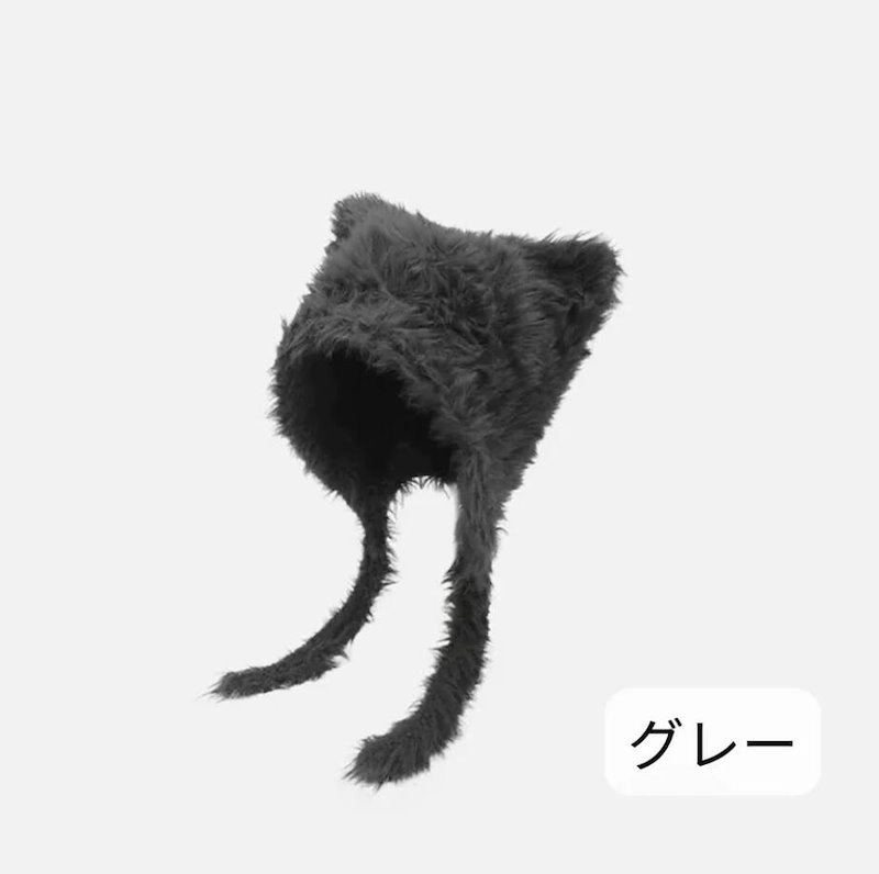 猫耳付き フェイクファー ボンネット 帽子 ニットキャップ 顎紐付き ふわふわ もこもこ キャット カジュアル アニマル 小物 小顔効果 ガーリー 学生 暖かい あったか 小顔効果