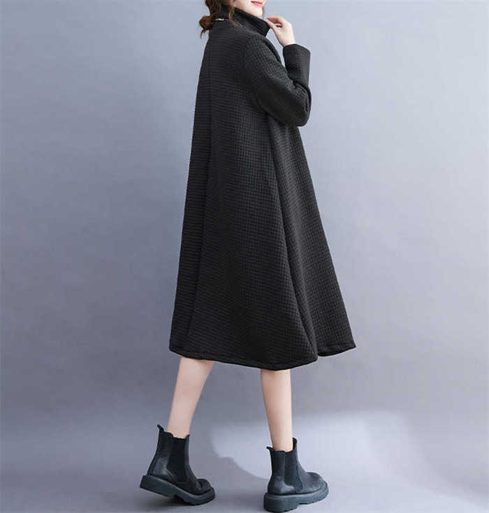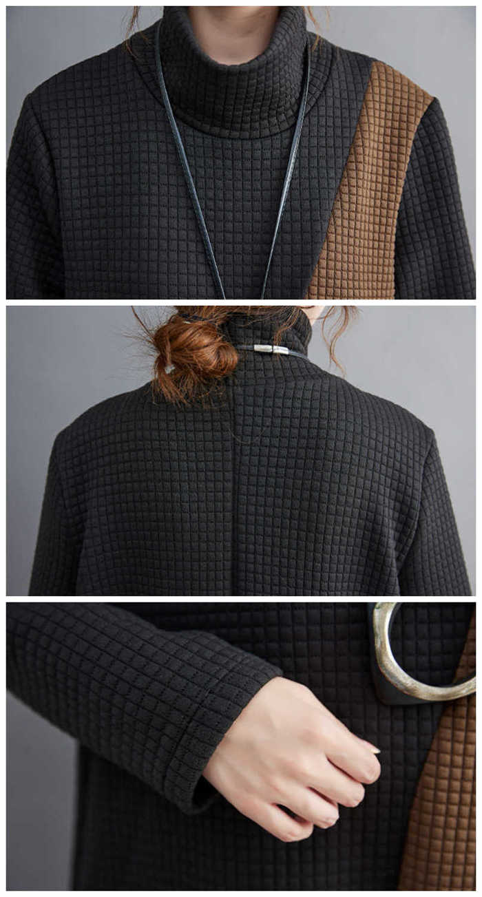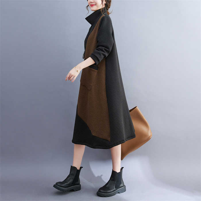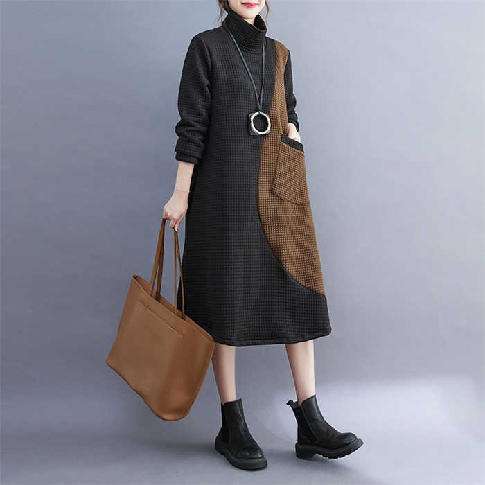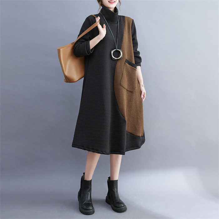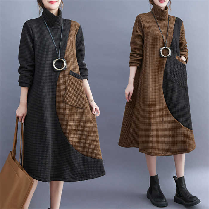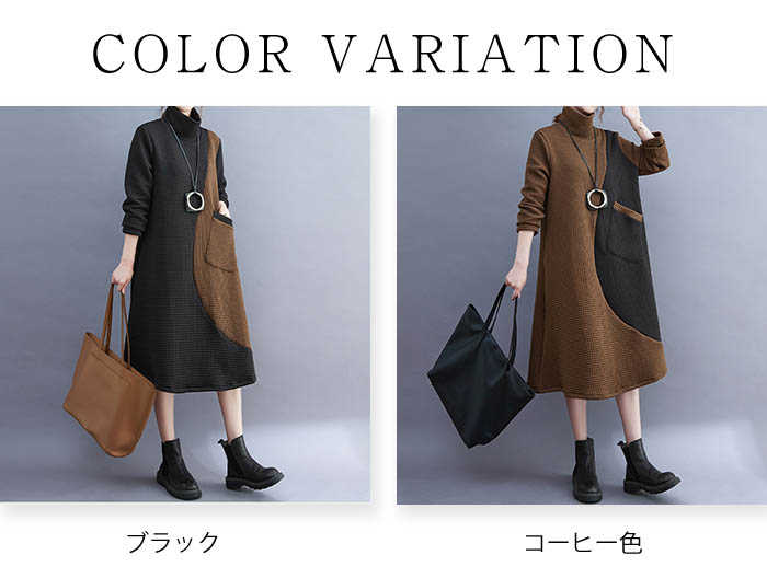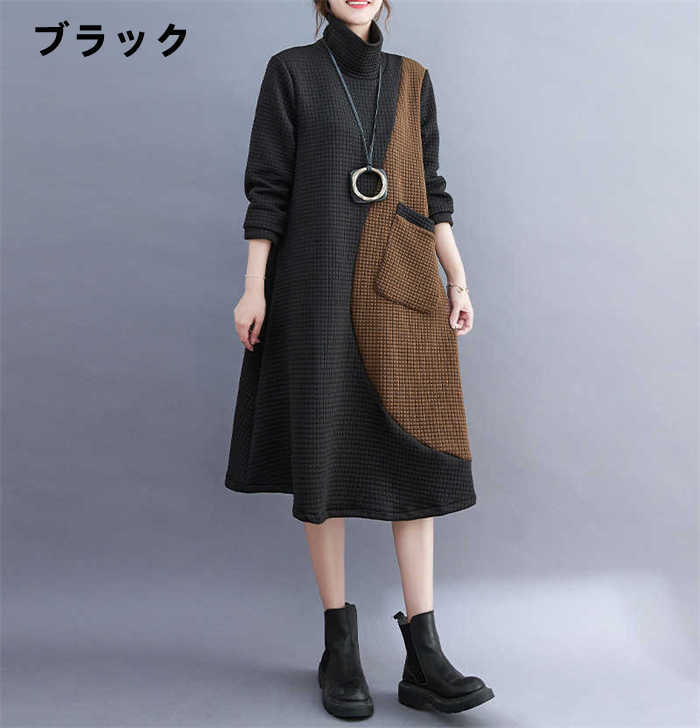 ワンピース レディース ハイネック タートルネック ワンピ 配色 切り替え 膝丈 長袖 秋 冬 シンプル おしゃれ 無地 体型カバー ポケット付き レトロ エレガント カジュアル お洒落 通勤 OL