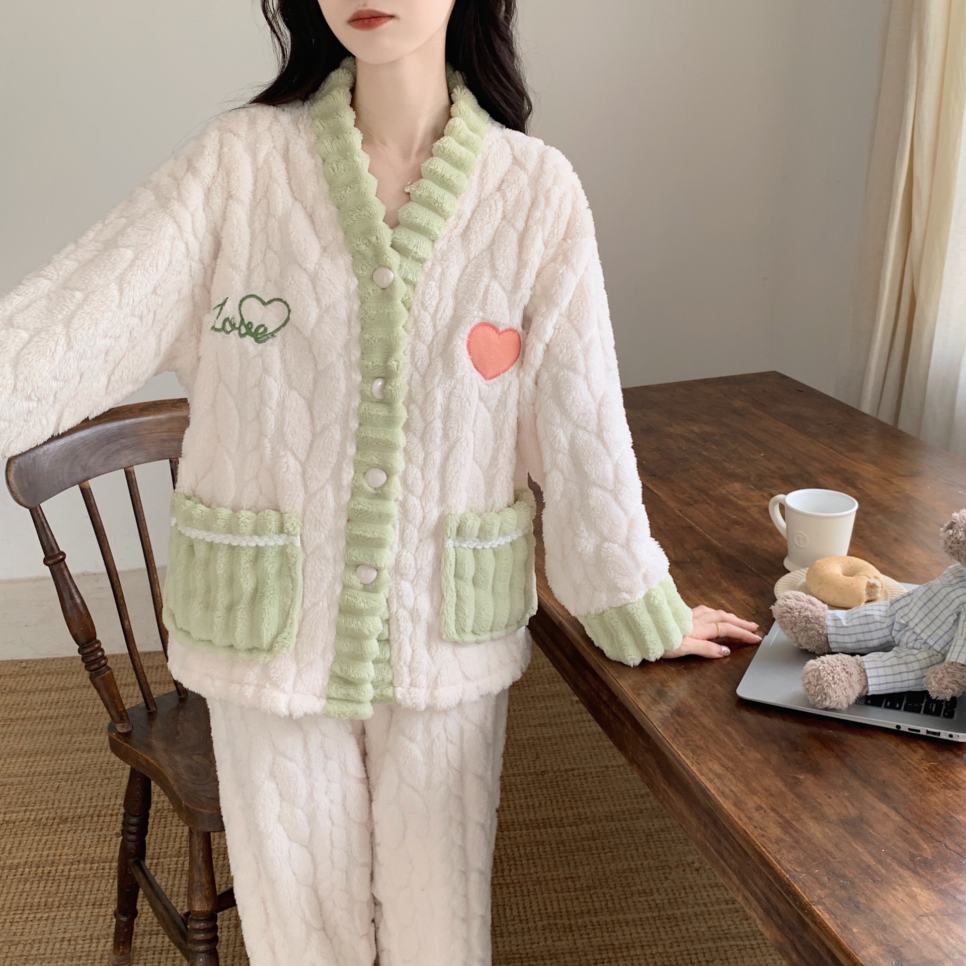 パジャマ レディース 珊瑚絨毯パジャマ女性の冬の新型加絨厚保温スイートルームウェアセット 部屋着 セットアップ 可愛い モコモコパジャマ ルームウェア