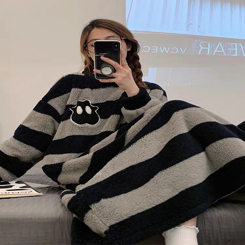 パジャマ ナイトガウン女性秋と冬のぬいぐるみストライプのパジャマホームウェアドレス パジャマ