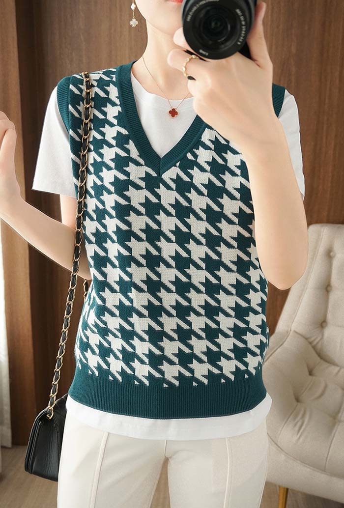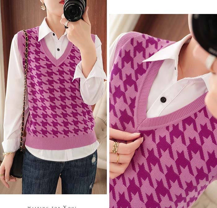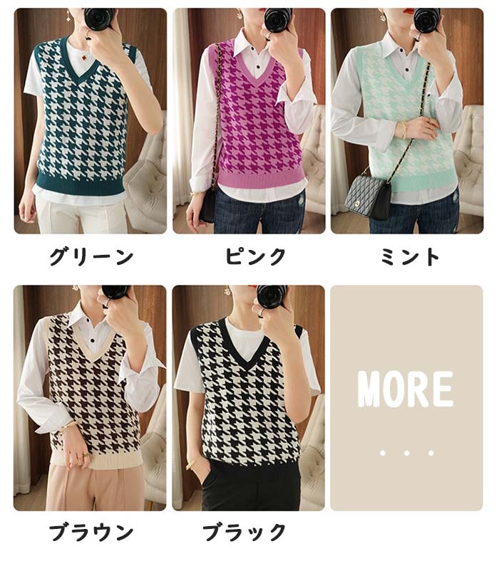 ニットベスト 千鳥格子 レディース ベスト Vネック トップス 重ね着 定番 ニット きれいめ ノースリーブ カジュアル 大人 かわいい シンプル 春 秋 冬 コーデやすい