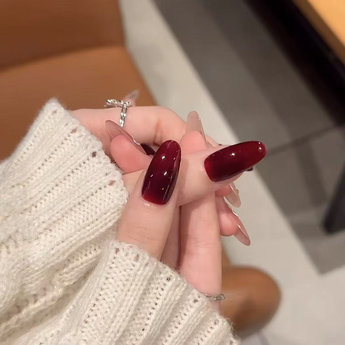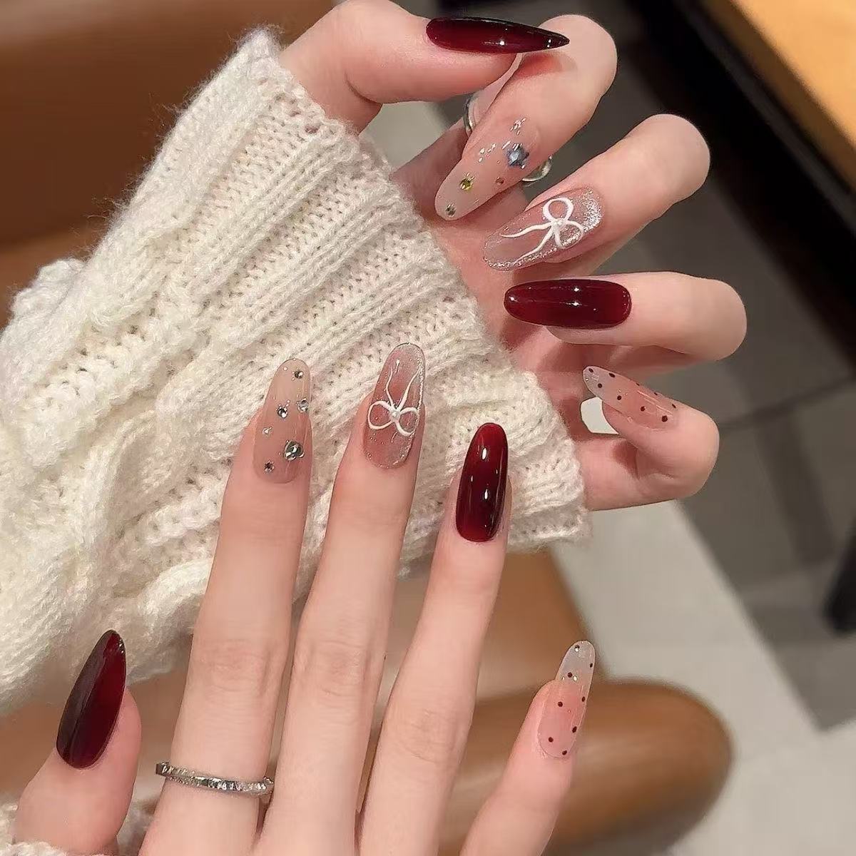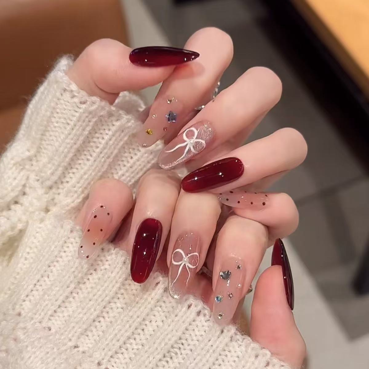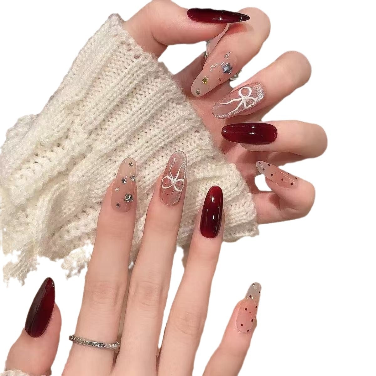 甲を着て秋冬高級感のある車センチ赤い甲片猫眼蝶ネクタイが白いネイルアートを見せている ネイルチップ
