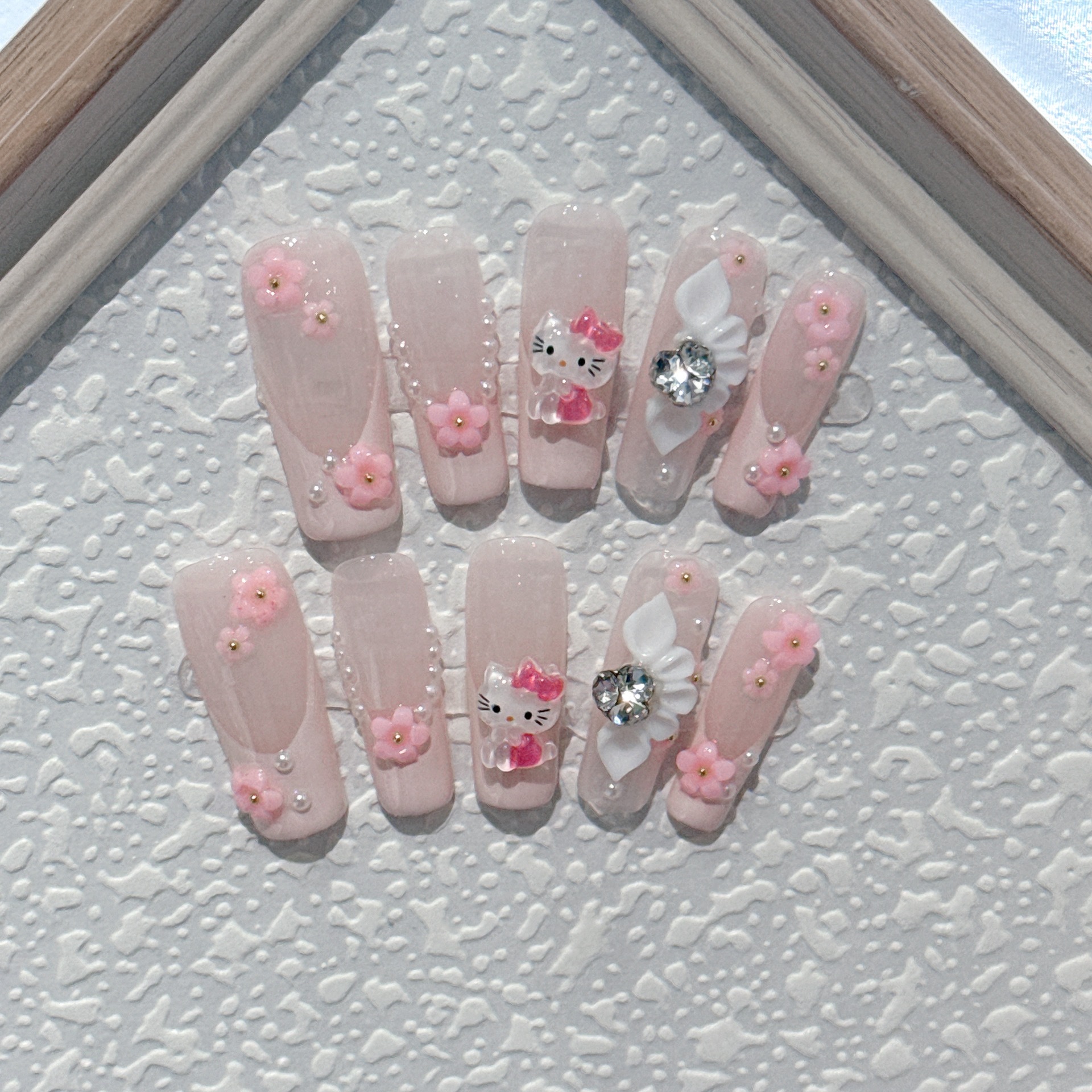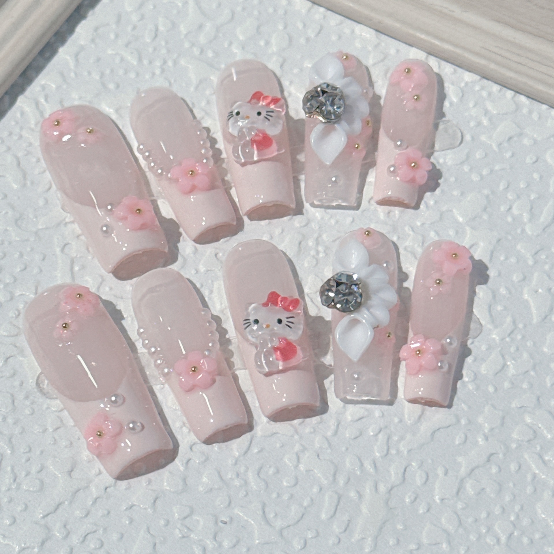 甲のフランスの子猫のピンクの花を着てかわいい甲片の美甲片を着ます ネイルチップ